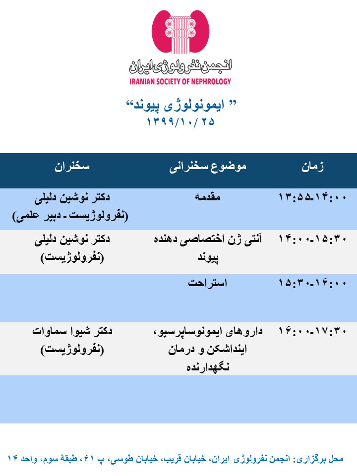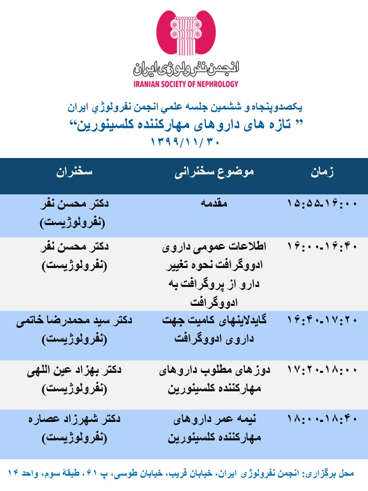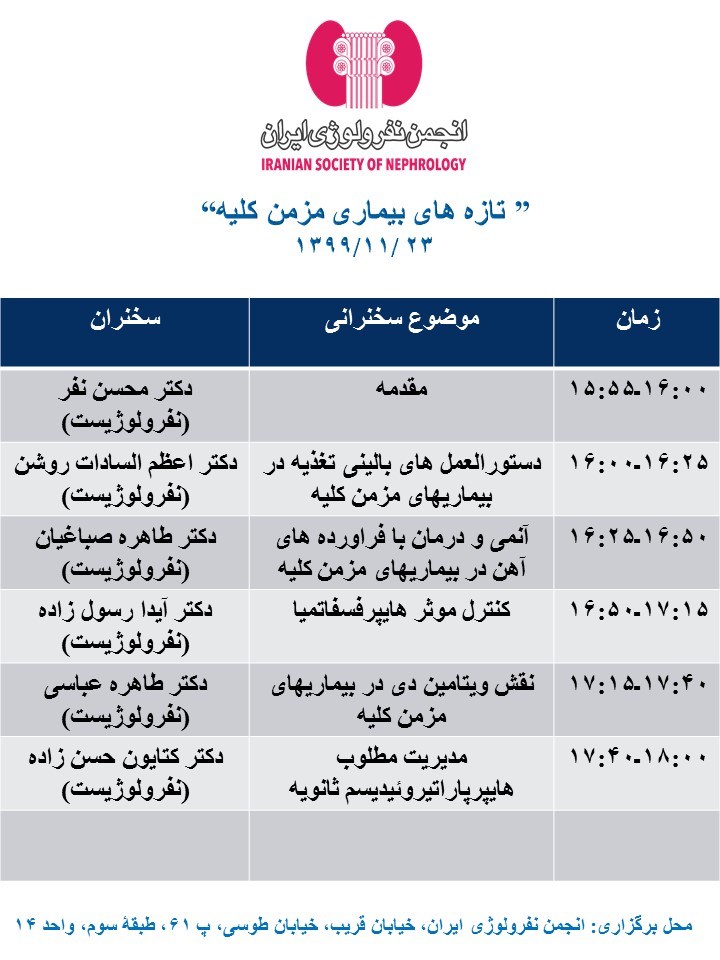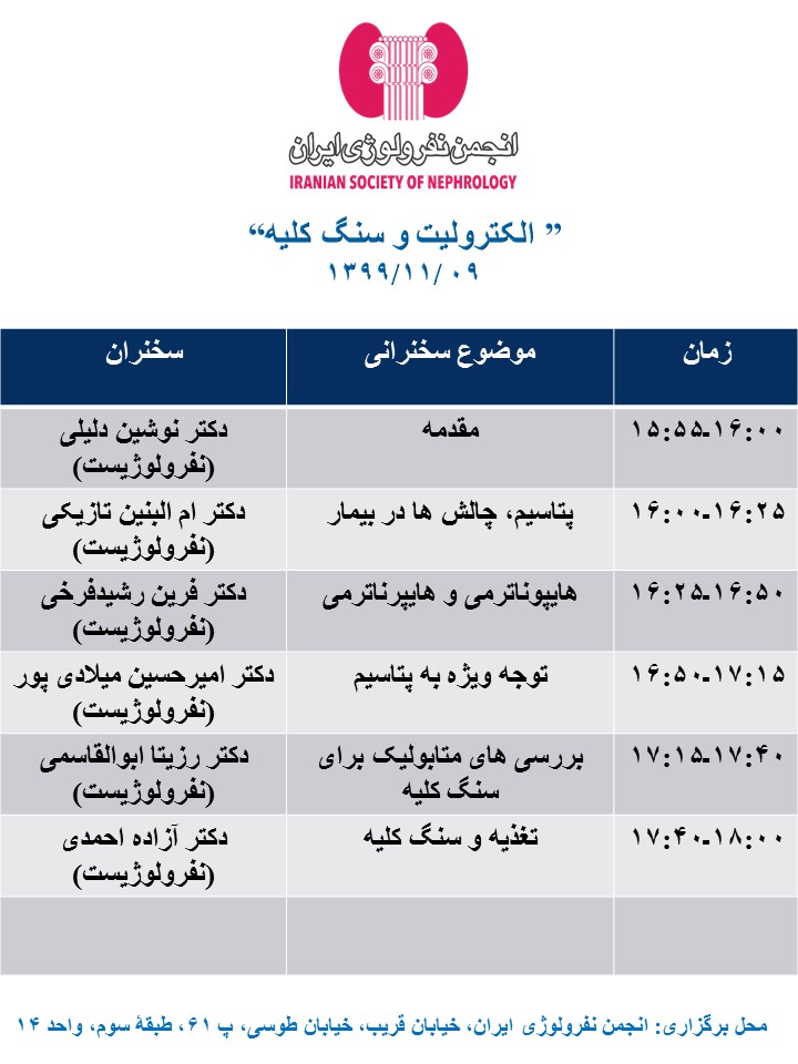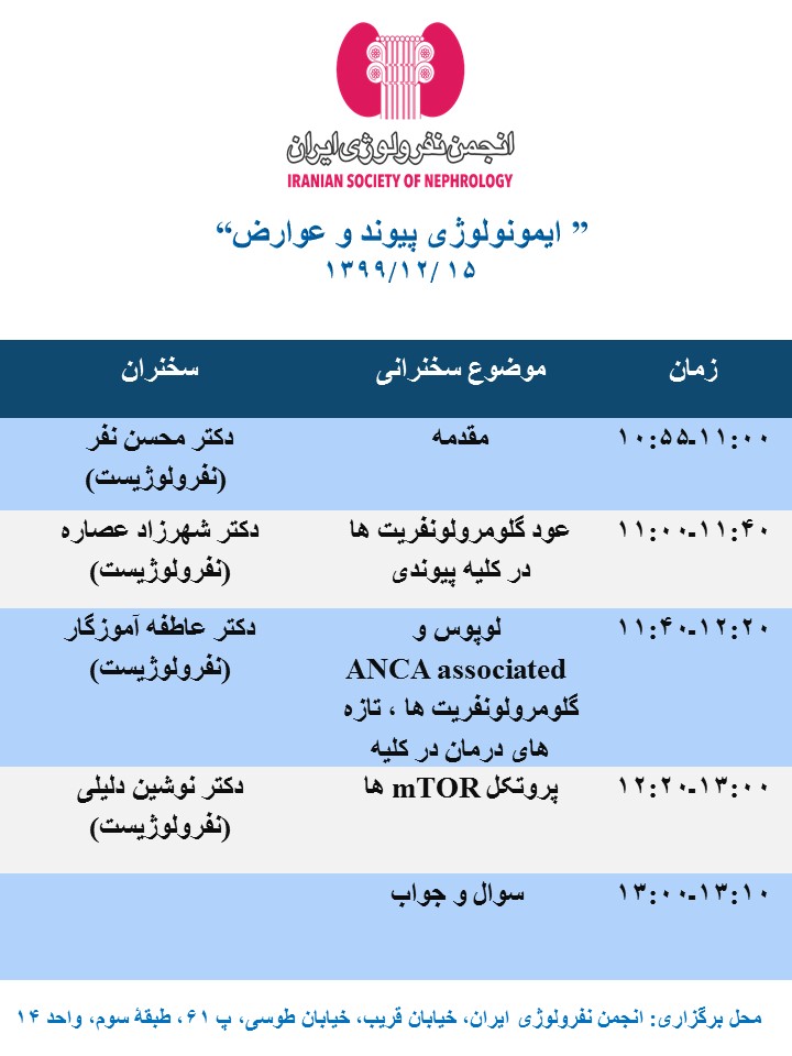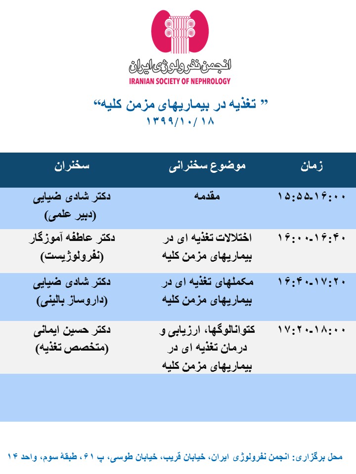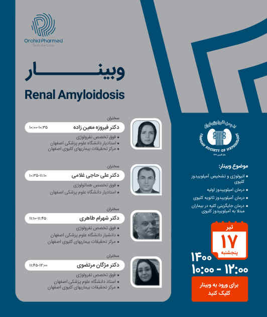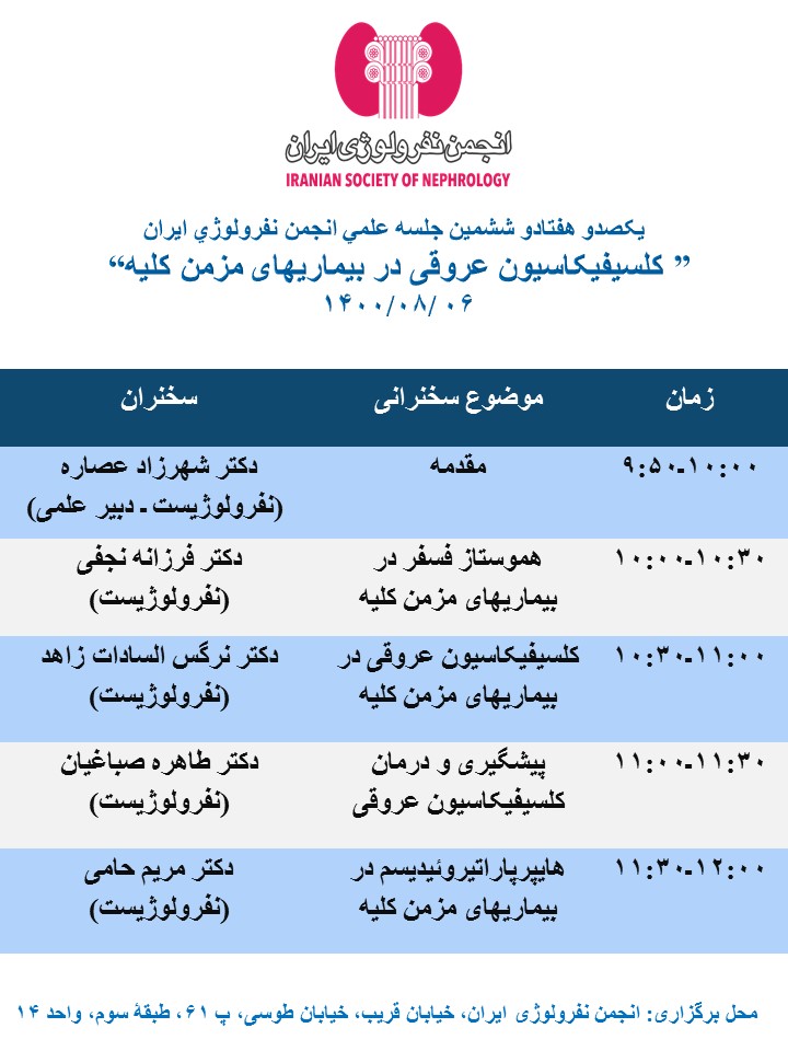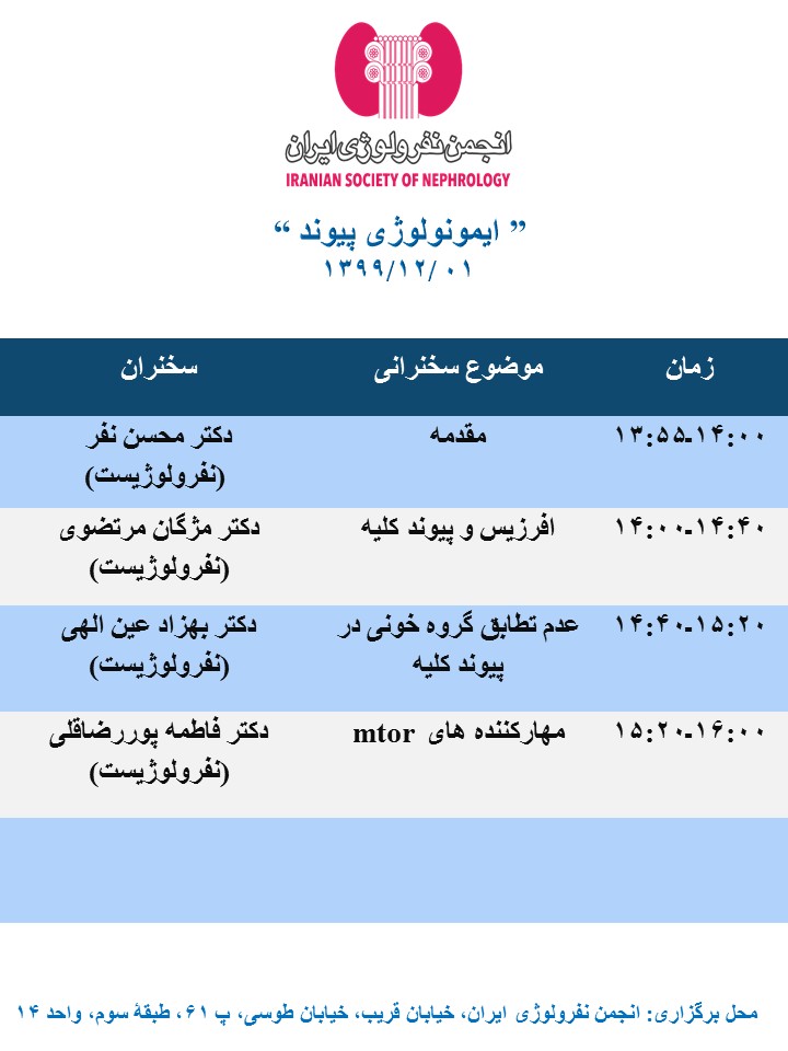 سخنرانان: دکتر مسعود خسروی (نفرولوژیست)، دکتر پگاه آقاجان زاده (نفرولوژیست)، دکتر امیراحمد نصیری (نفرولوژیست)، دکتر امیر کازری (نفرولوژیست، دانشگاه فلوریدا)