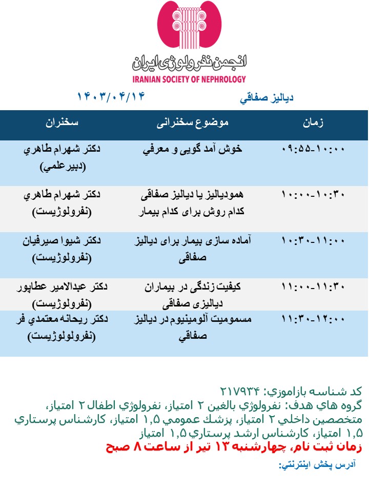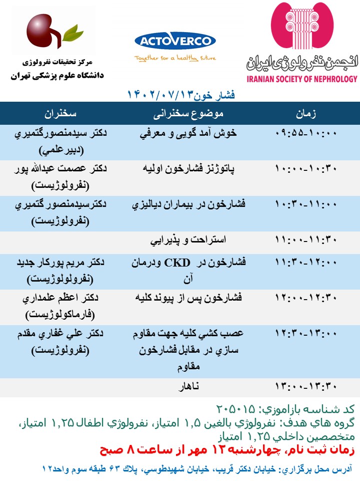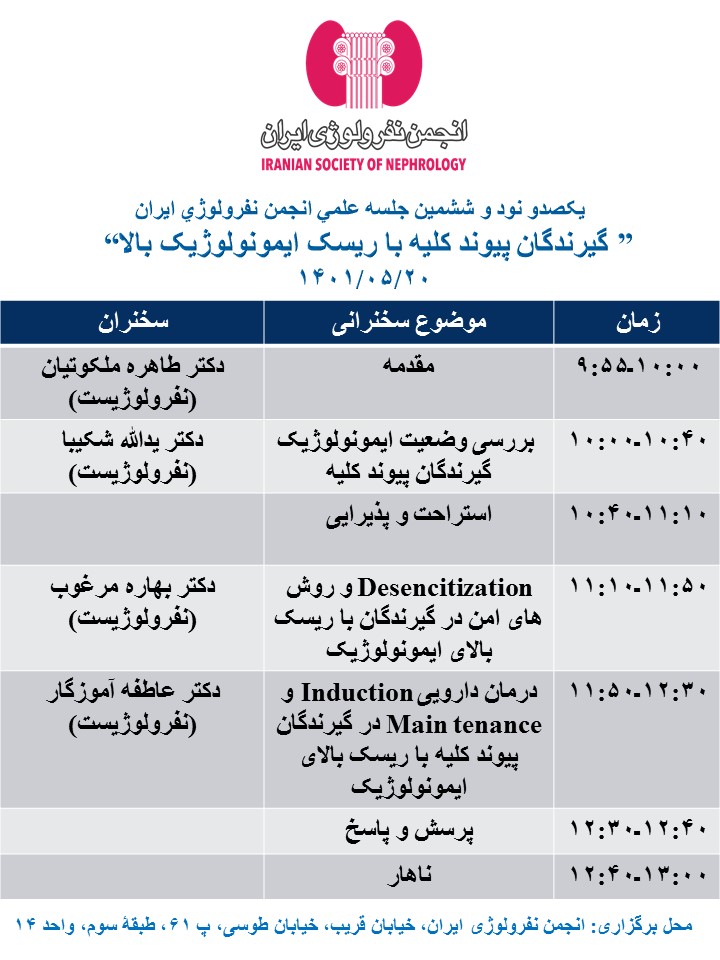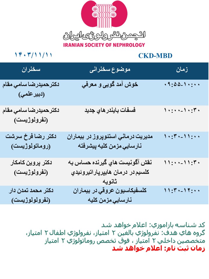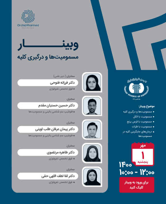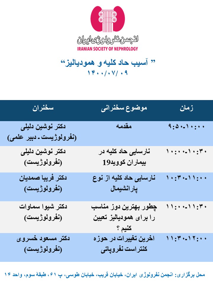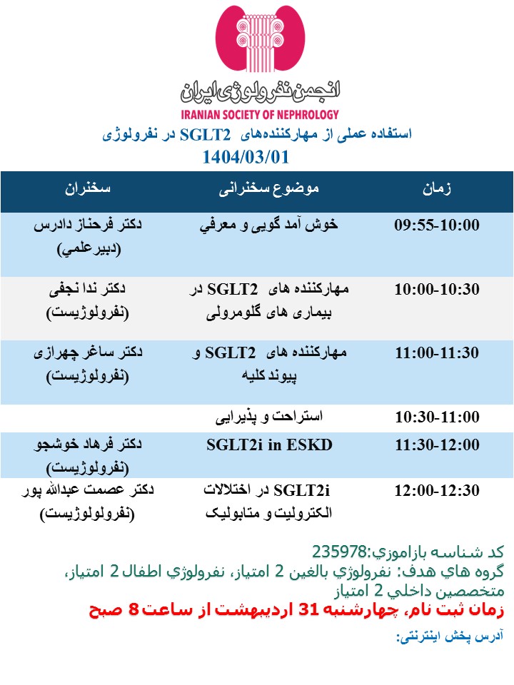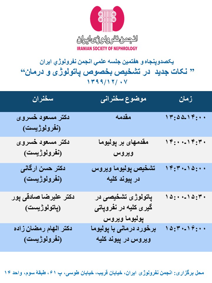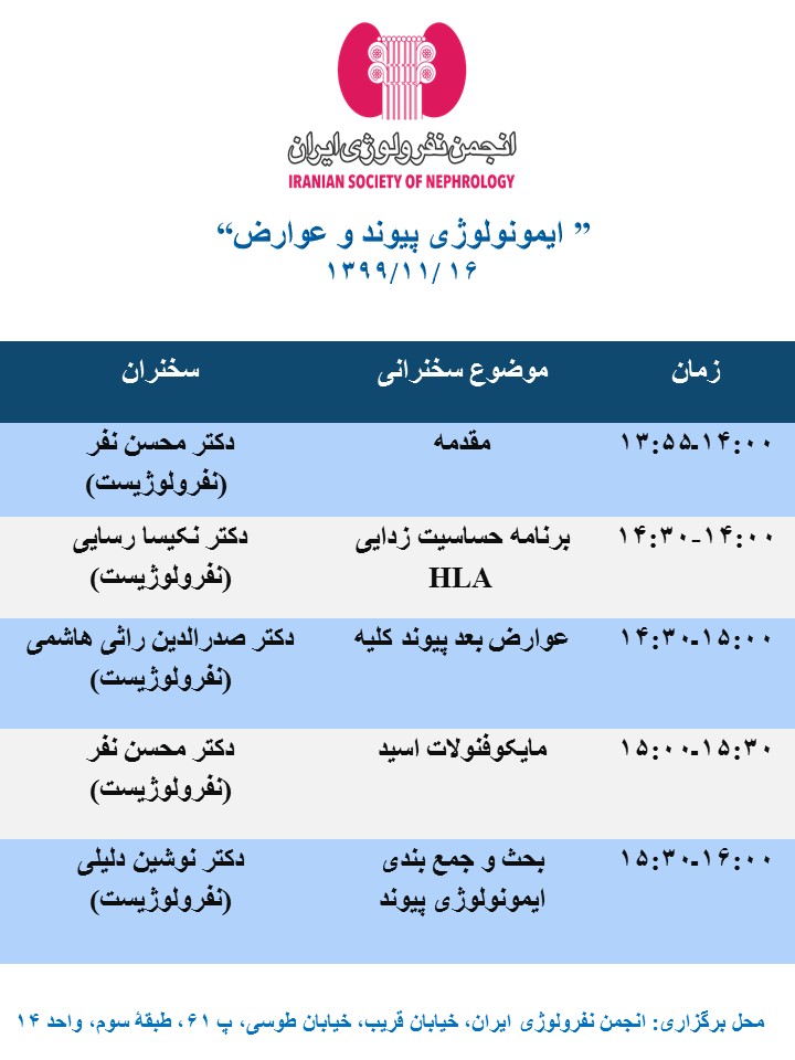 سخنرانان: دکتر مسعود خسروی (نفرولوژیست)، دکتر پگاه آقاجان زاده (نفرولوژیست)، دکتر امیراحمد نصیری (نفرولوژیست)، دکتر امیر کازری (نفرولوژیست، دانشگاه فلوریدا)