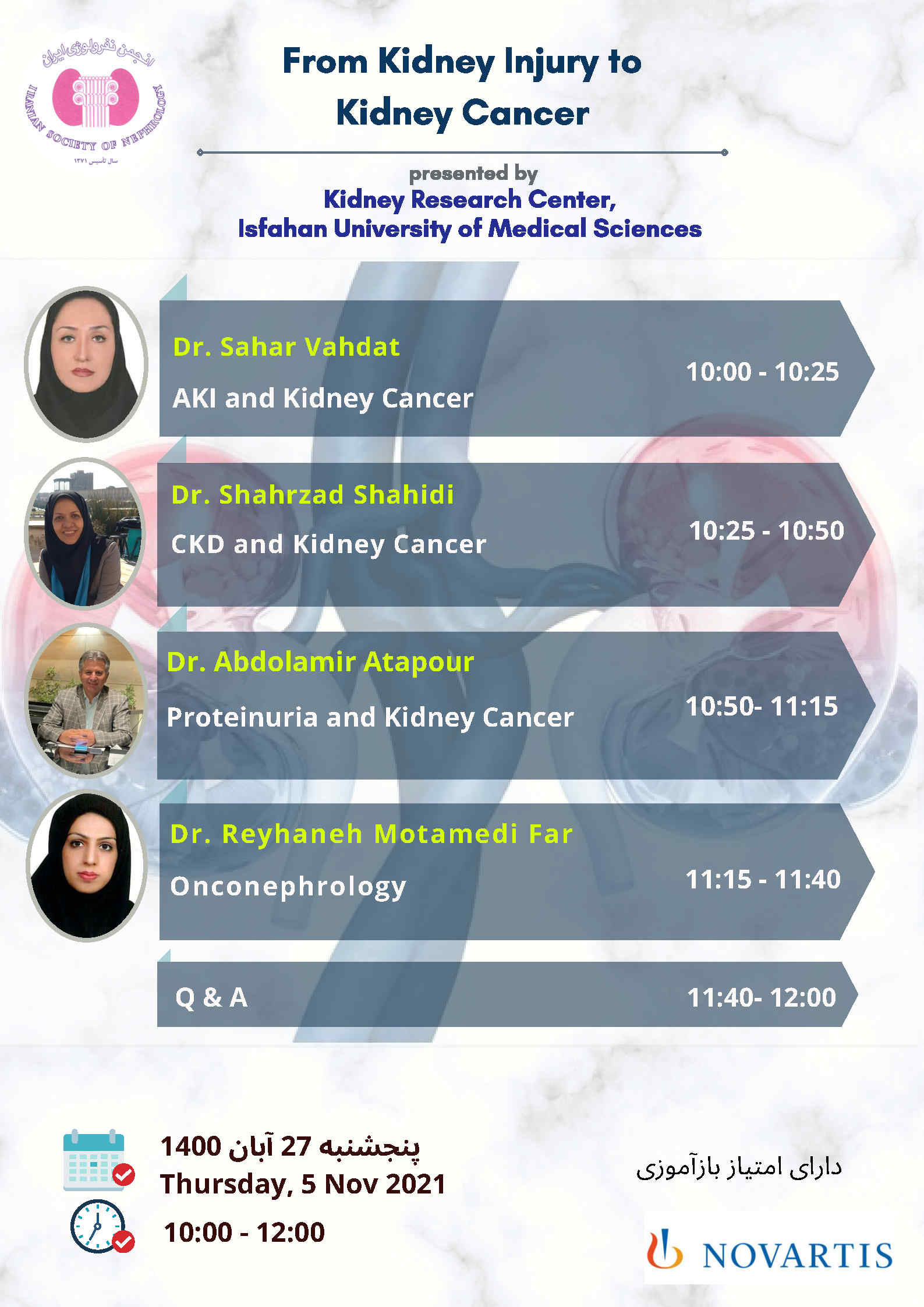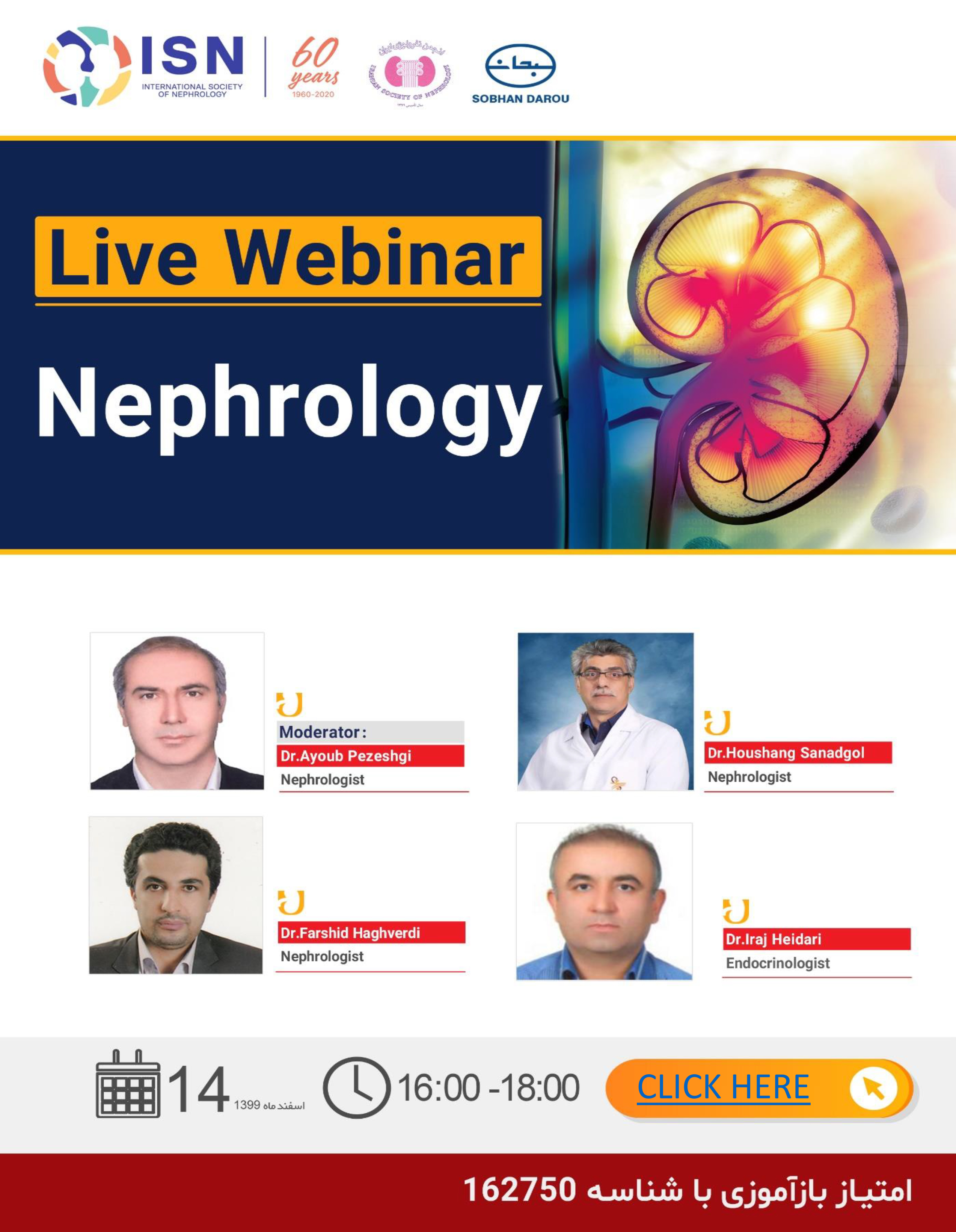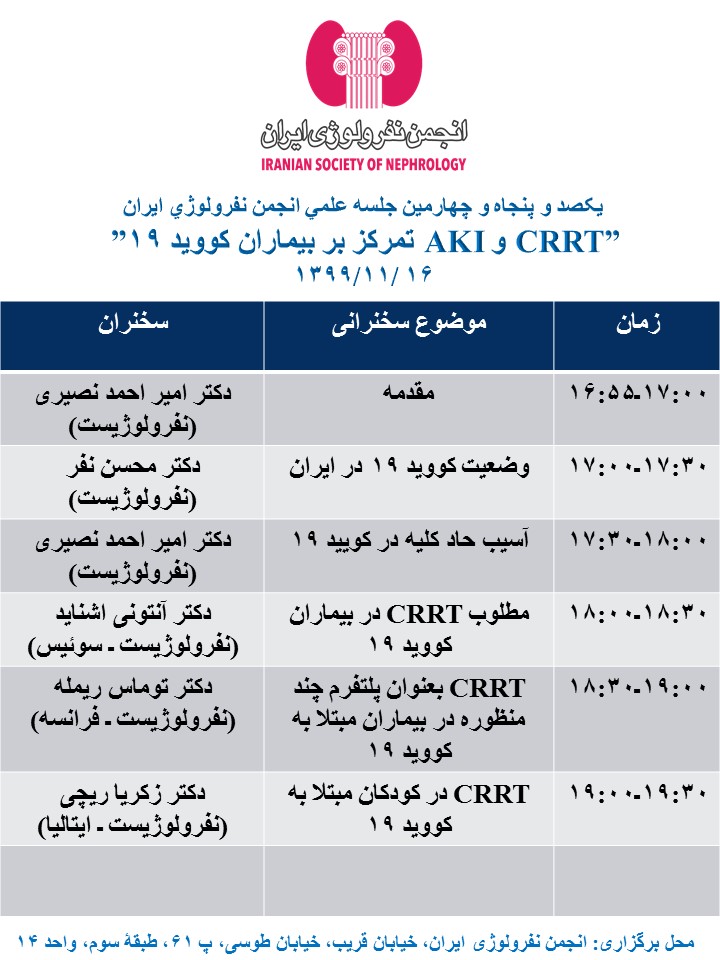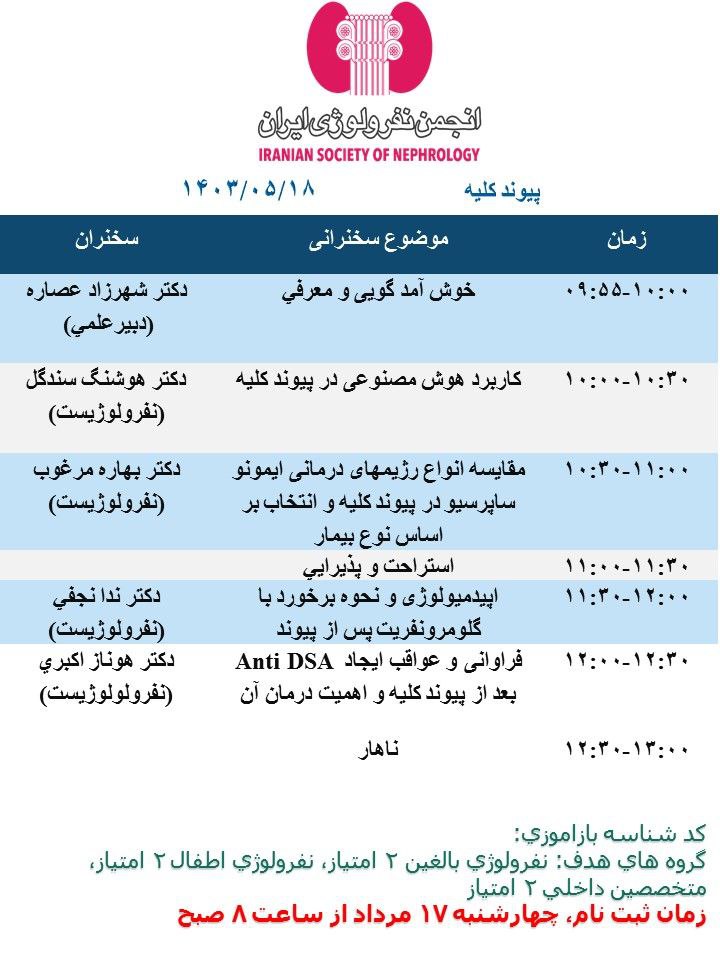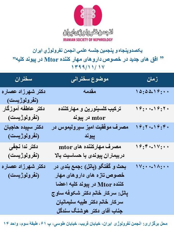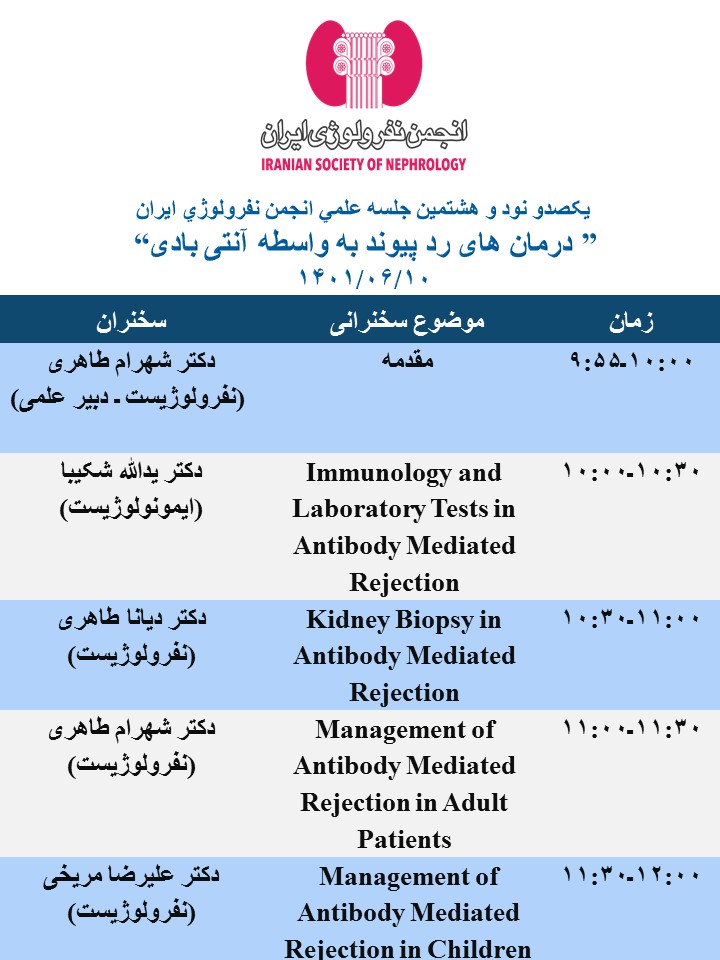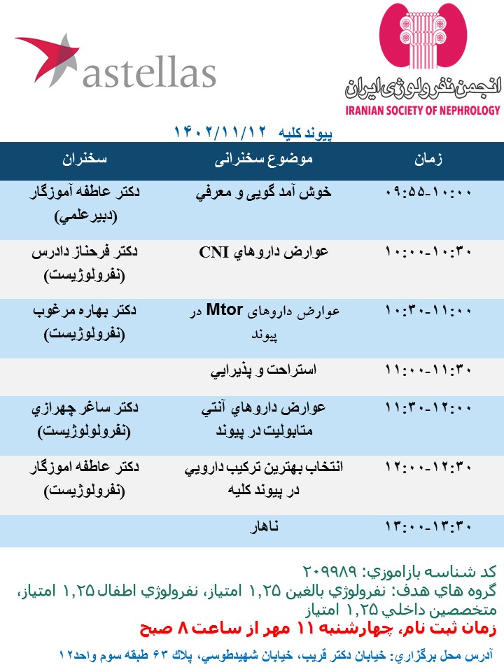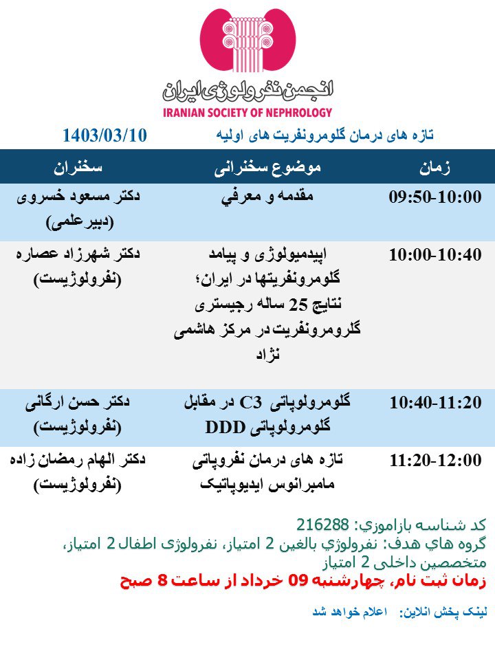 سخنرانان: دکتر مسعود خسروی (نفرولوژیست)، دکتر پگاه آقاجان زاده (نفرولوژیست)، دکتر امیراحمد نصیری (نفرولوژیست)، دکتر امیر کازری (نفرولوژیست، دانشگاه فلوریدا)