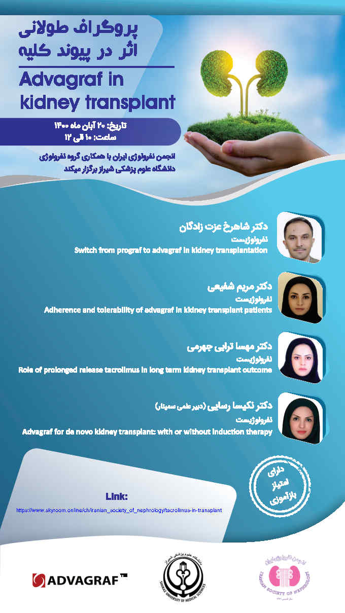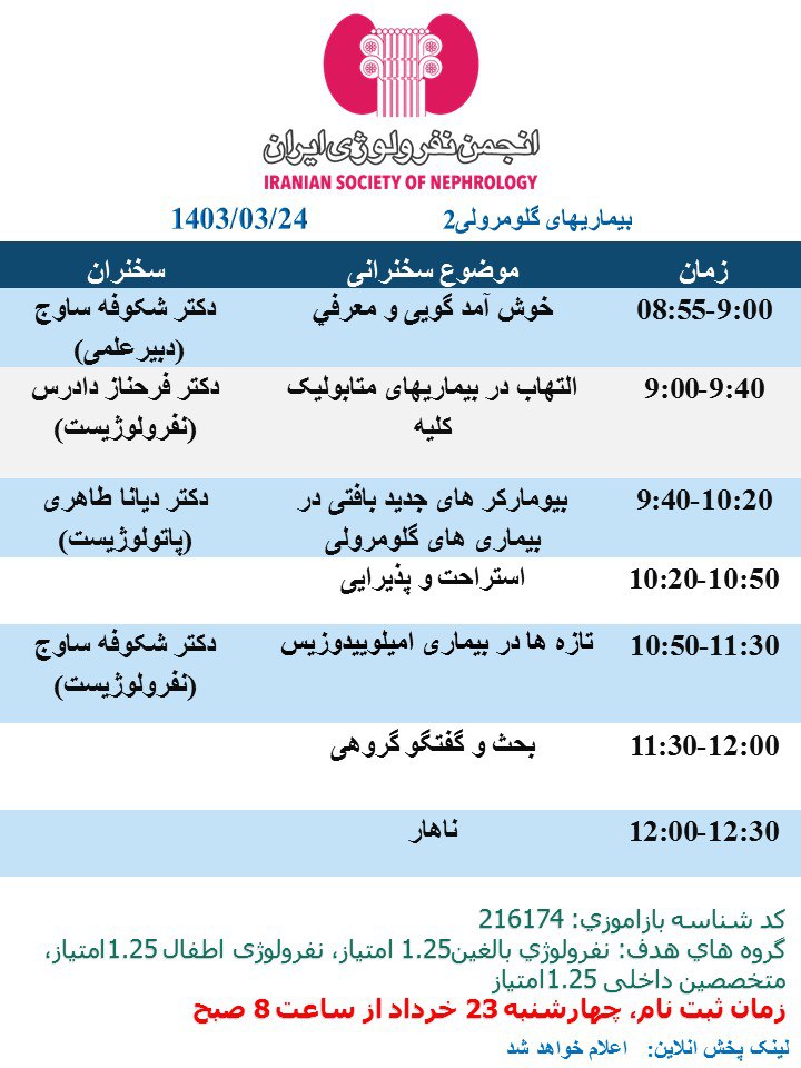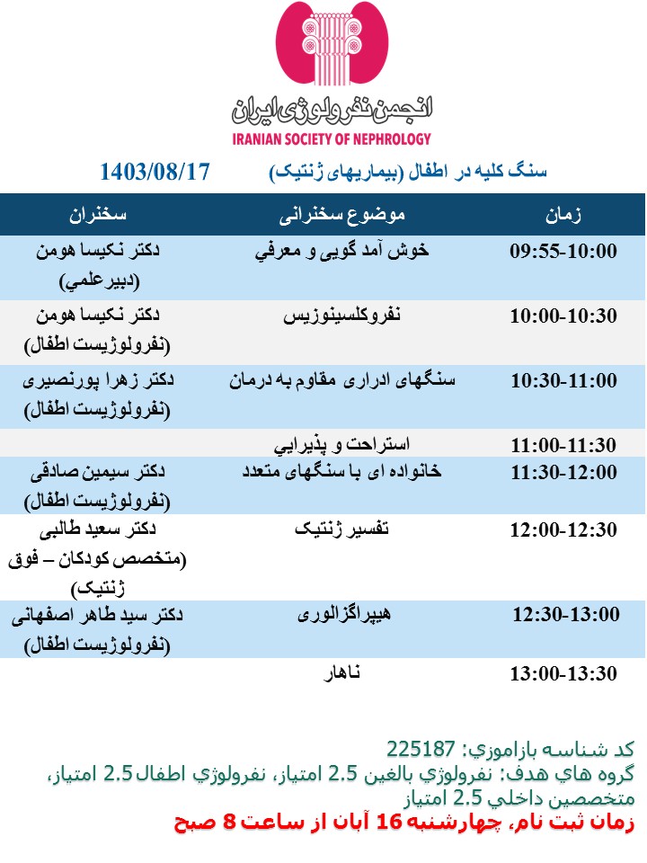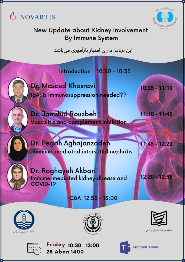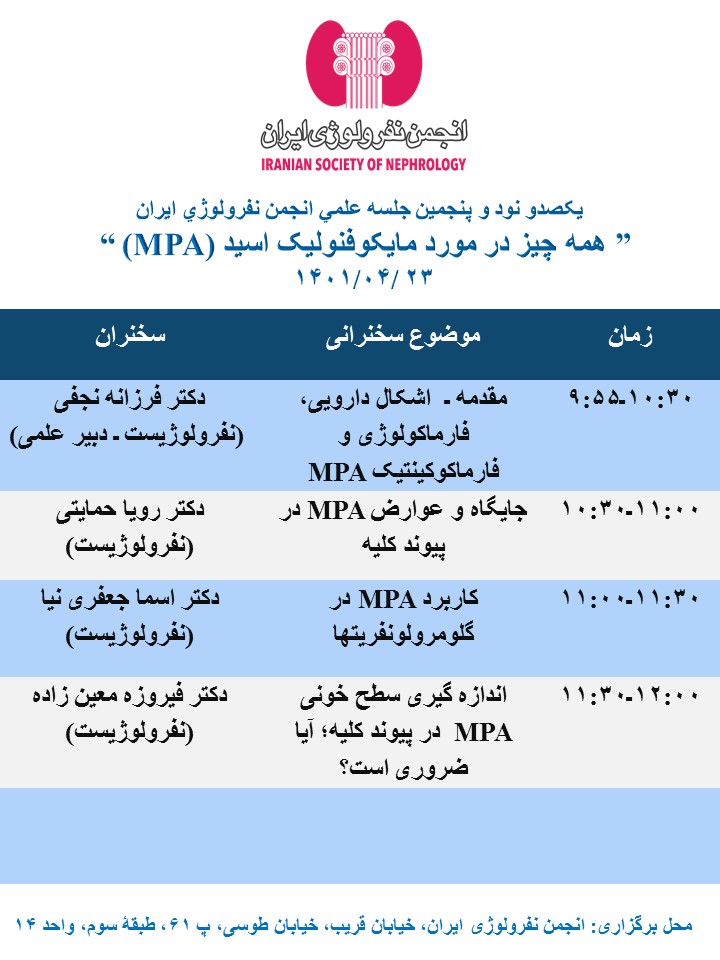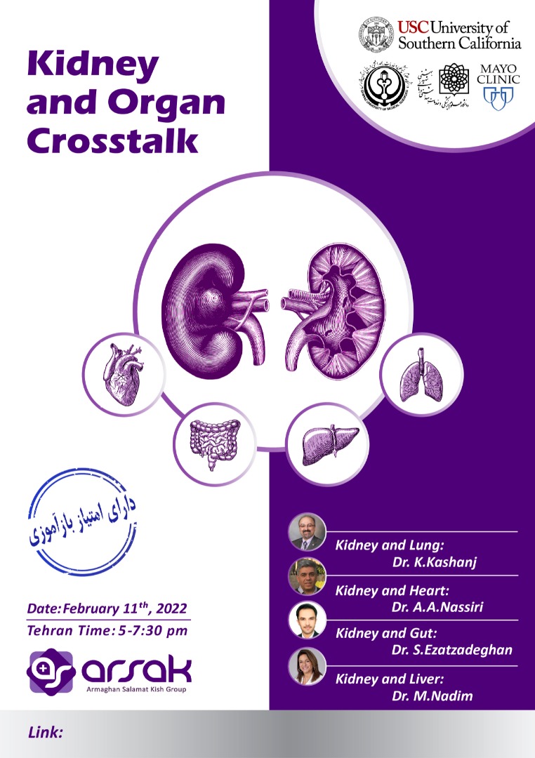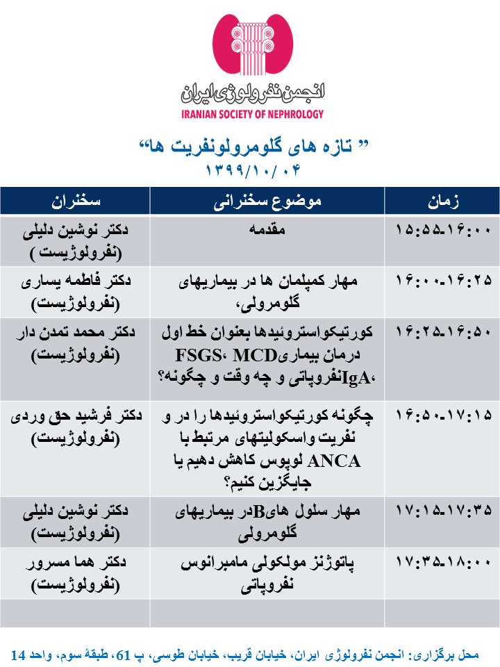سخنرانان: دکتر مسعود خسروی (نفرولوژیست)، دکتر پگاه آقاجان زاده (نفرولوژیست)، دکتر امیراحمد نصیری (نفرولوژیست)، دکتر امیر کازری (نفرولوژیست، دانشگاه فلوریدا)