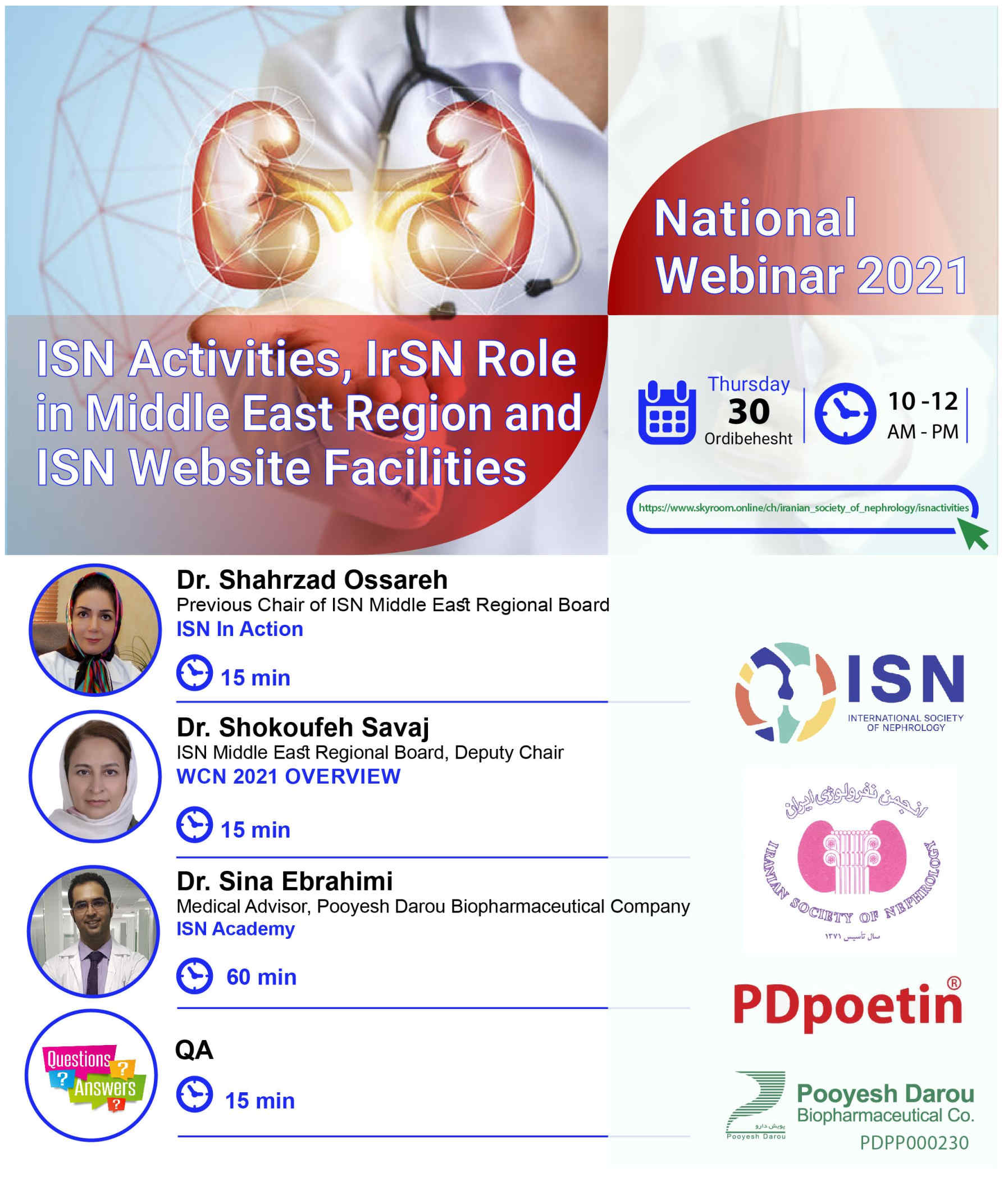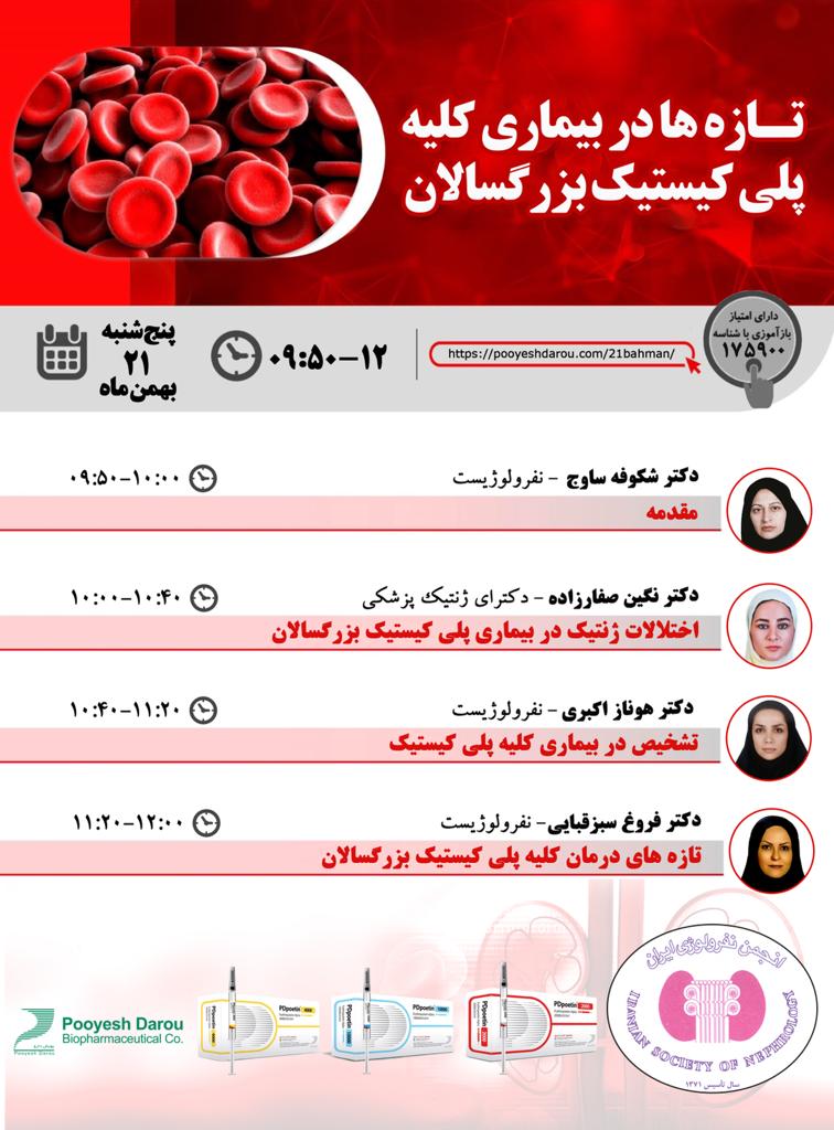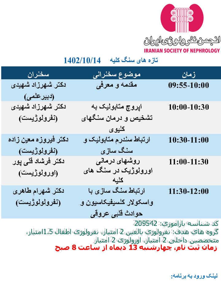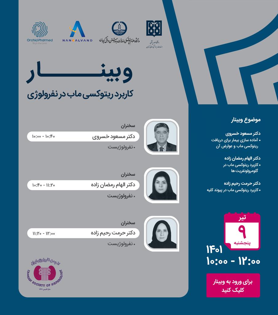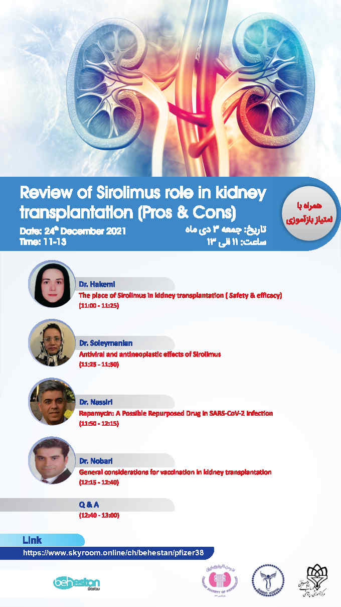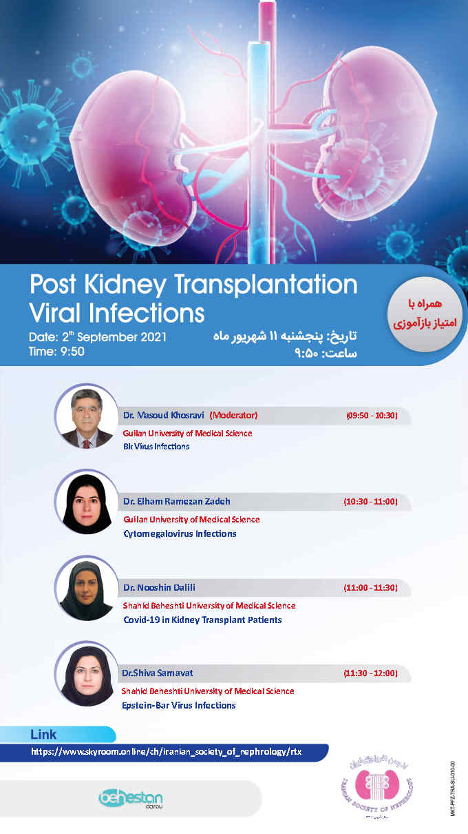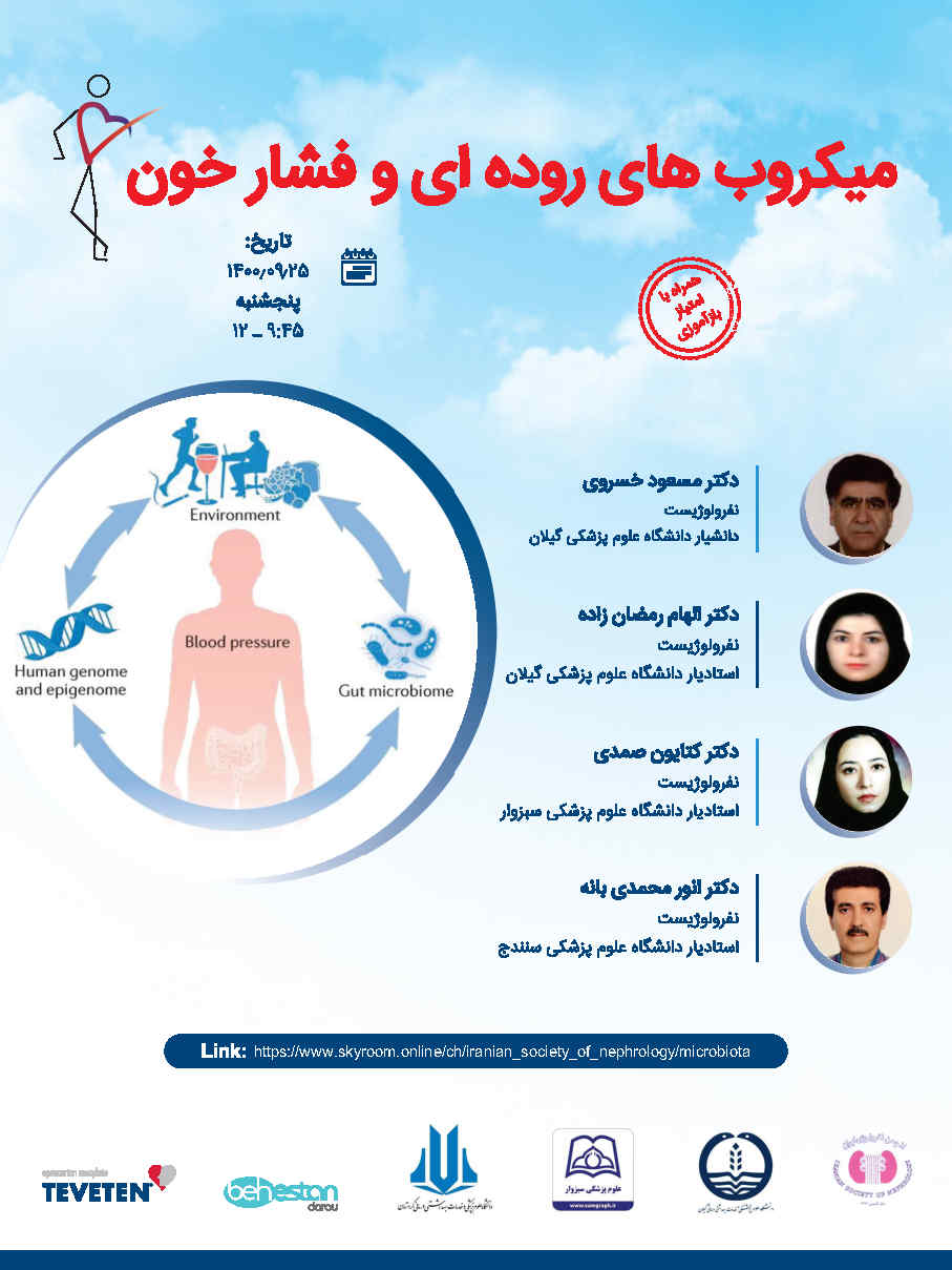 سخنرانان: دکتر مسعود خسروی (نفرولوژیست)، دکتر پگاه آقاجان زاده (نفرولوژیست)، دکتر امیراحمد نصیری (نفرولوژیست)، دکتر امیر کازری (نفرولوژیست، دانشگاه فلوریدا)