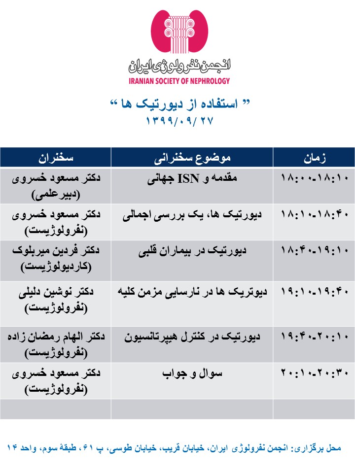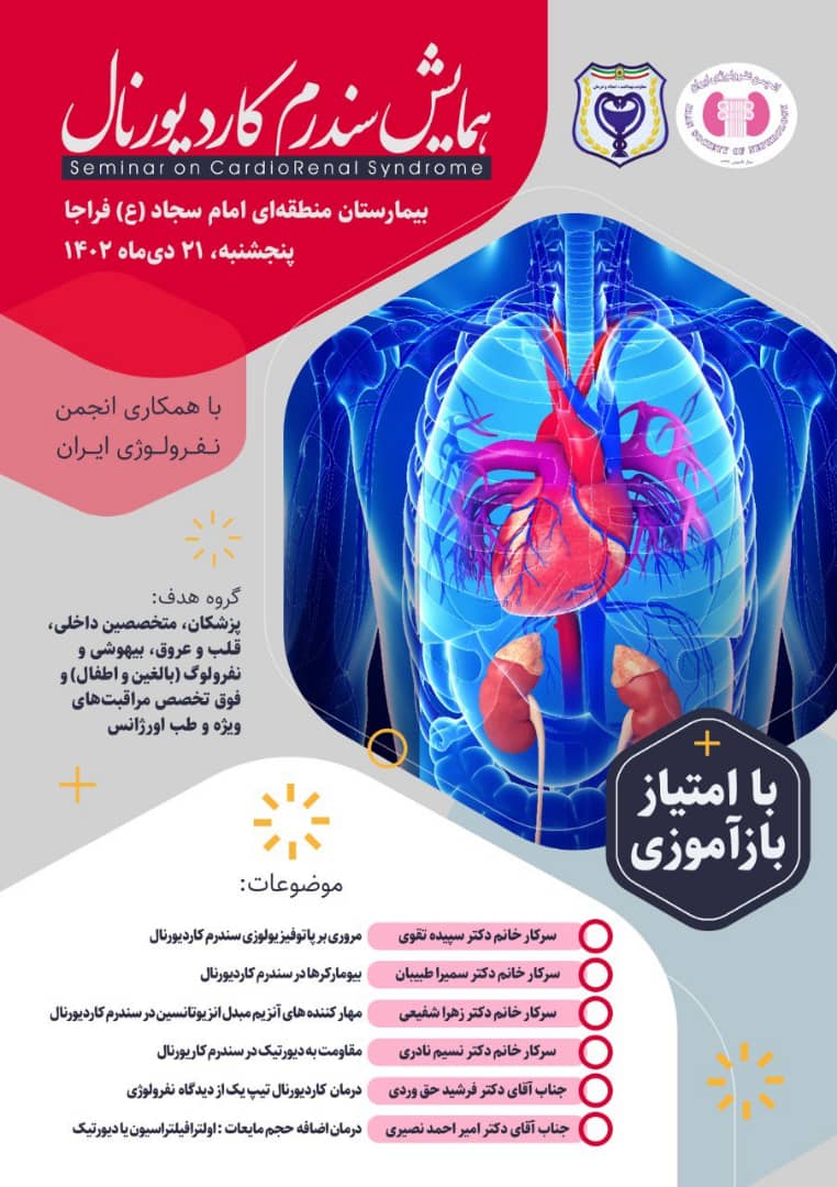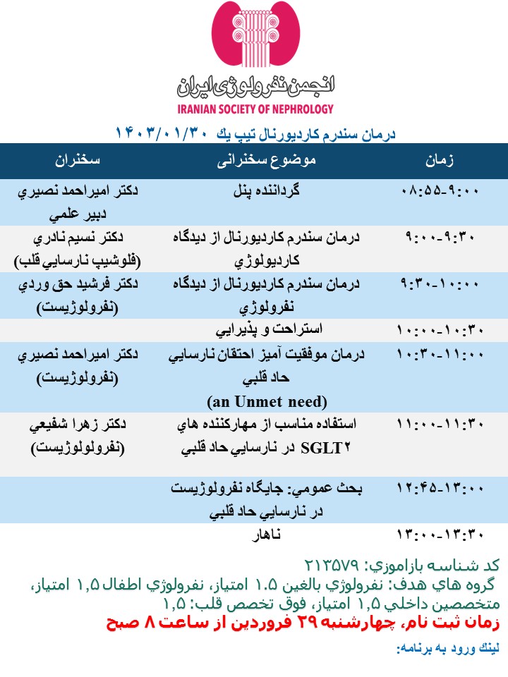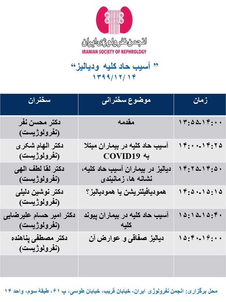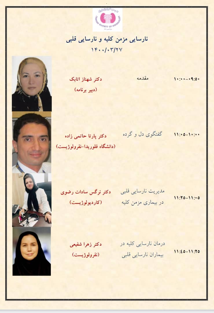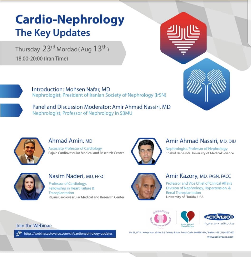 سخنرانان: دکتر احمد امین، دکتر نسیم نادری (کاردیولوژیست)، دکتر امیراحمد نصیری (نفرولوژیست)، دکتر امیر کازوری (نفرولوژیست، دانشگاه فلوریدا)