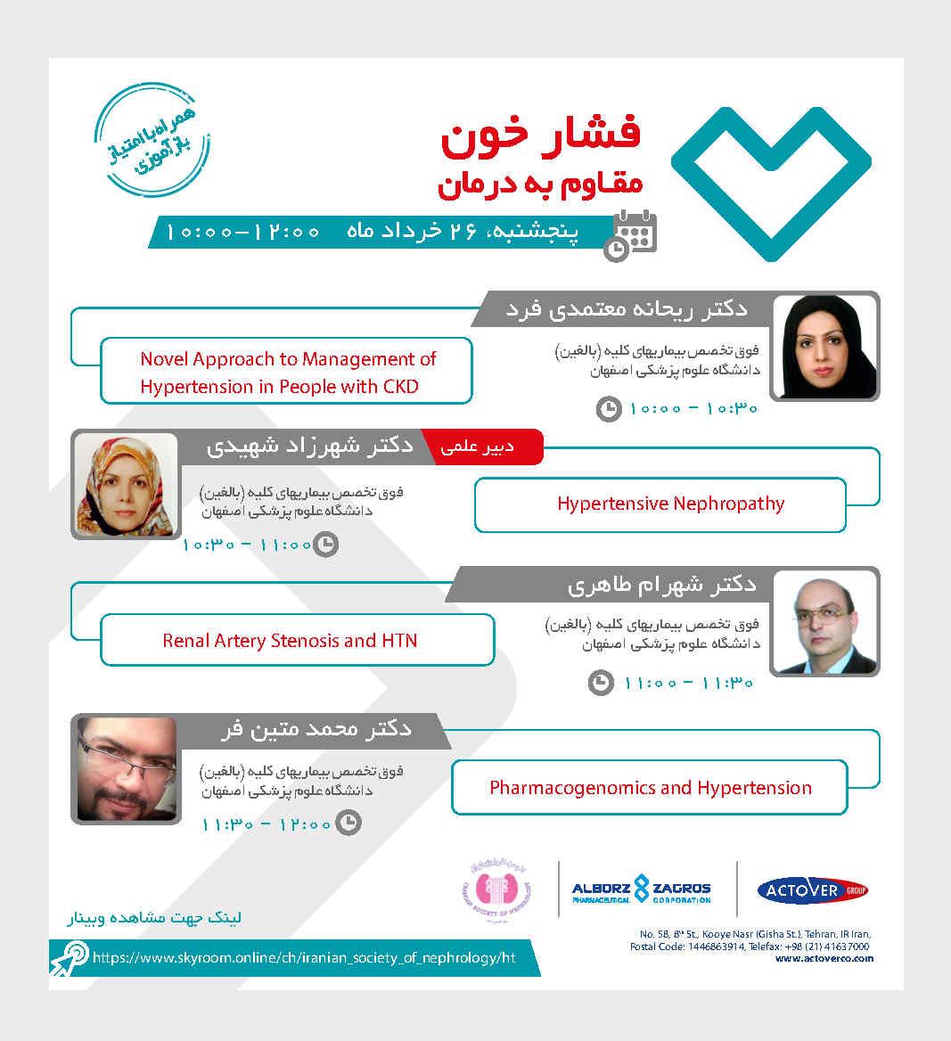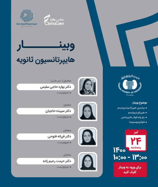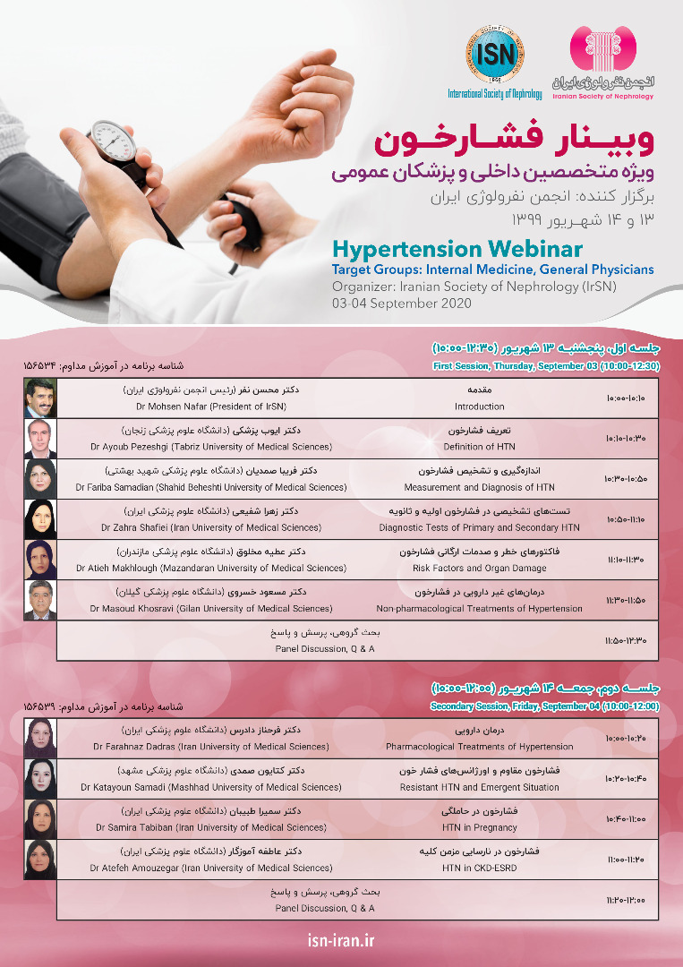 وبینار "فشارخون، ویژه متخصصان داخلی و پزشکان عمومی" پنجشنبه و جمعه 13 و 14 شهریورماه، ساعت 10 الی 12 (َSeptember 03-04, 2020)