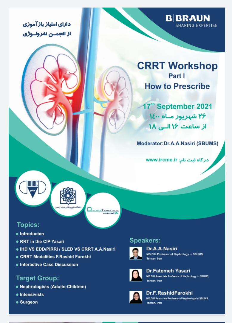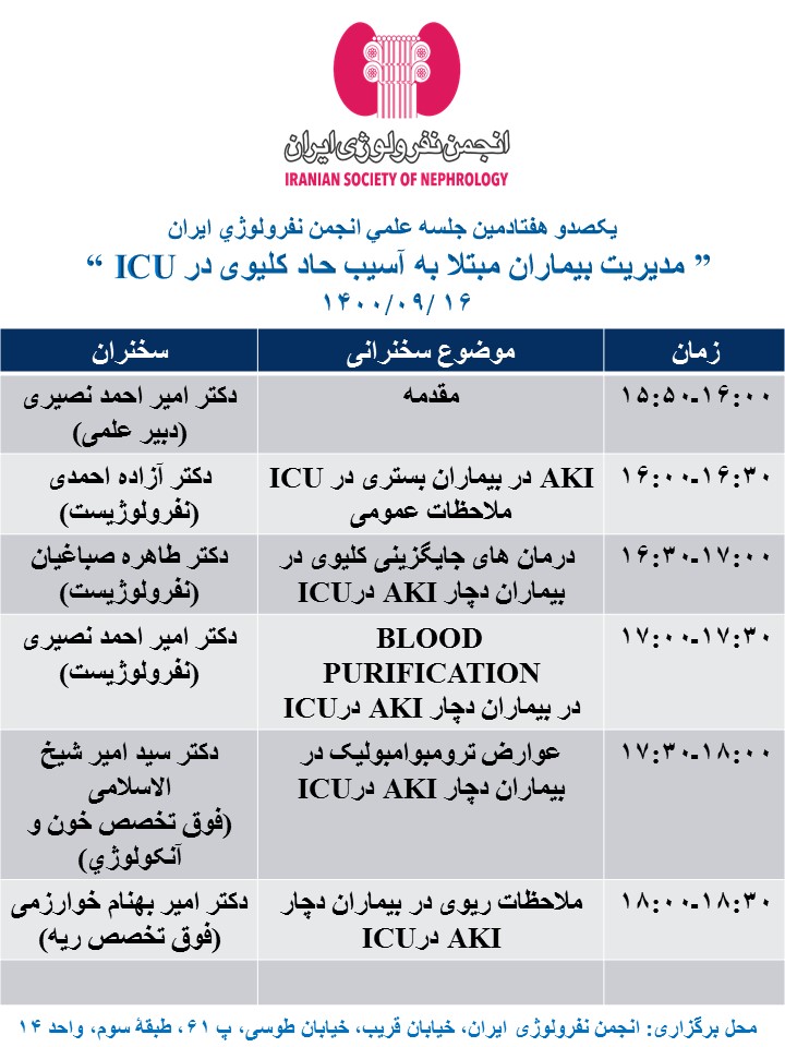 وبینار "مراقبتهای بحرانی کلیه-Critical Care Nephrology" پنجشنبه 03 مهرماه، ساعت 17 الی 19 (َSeptember 24, 2020) برگزار شد.