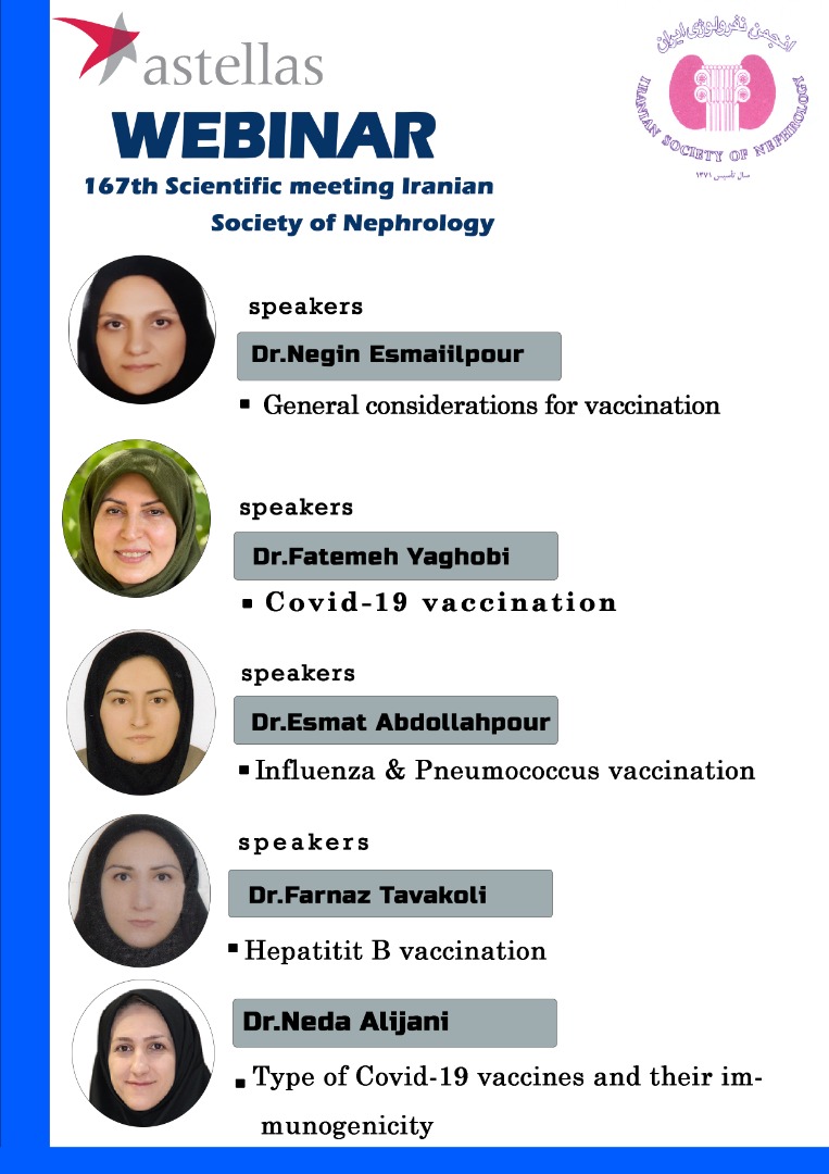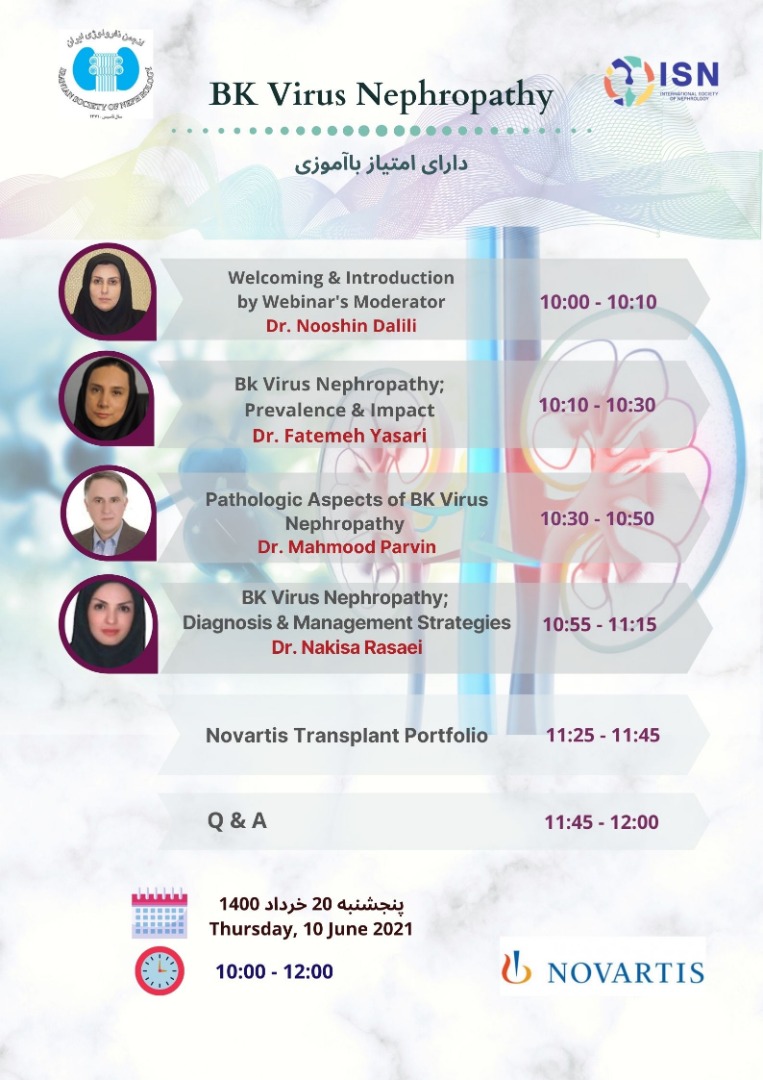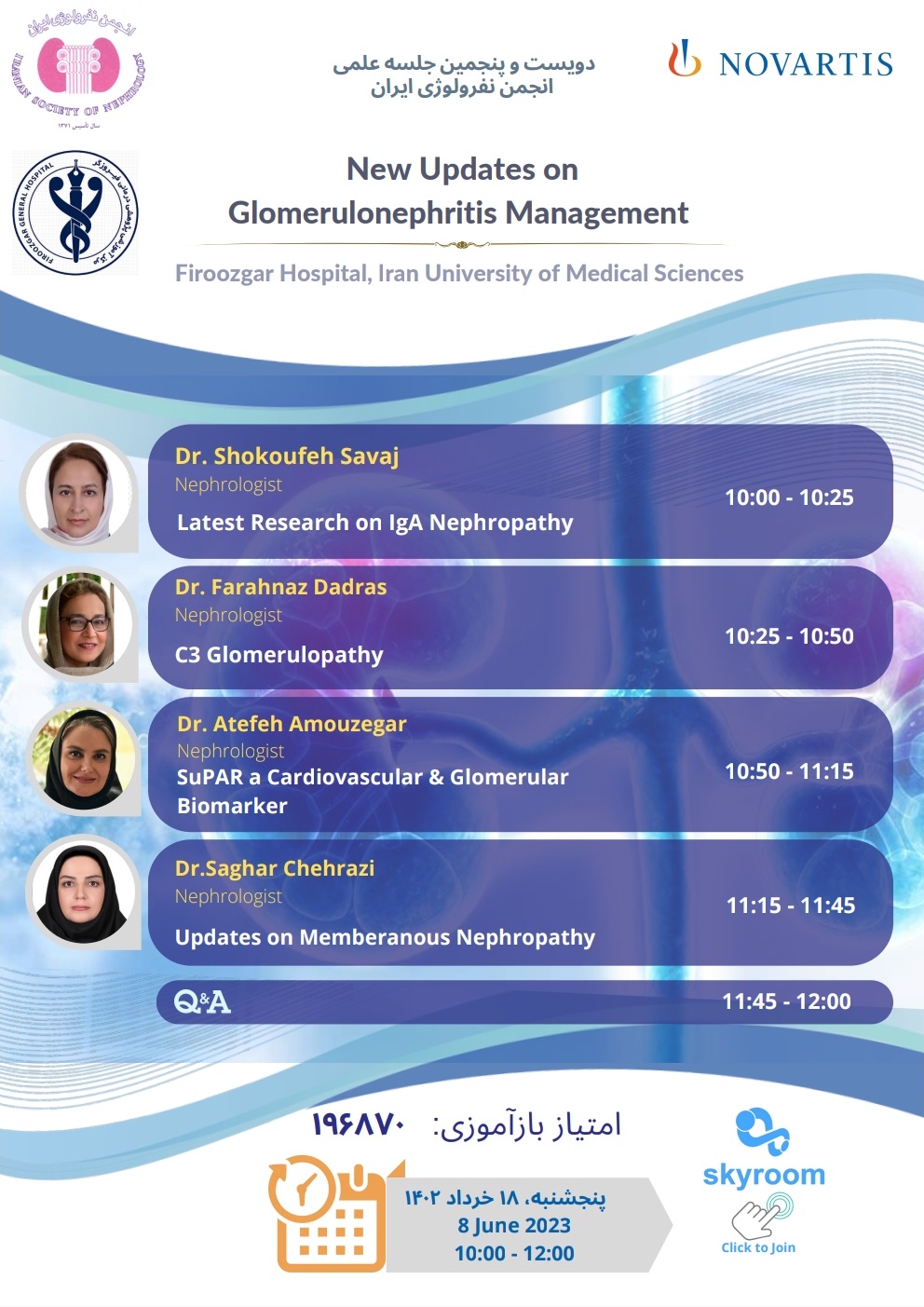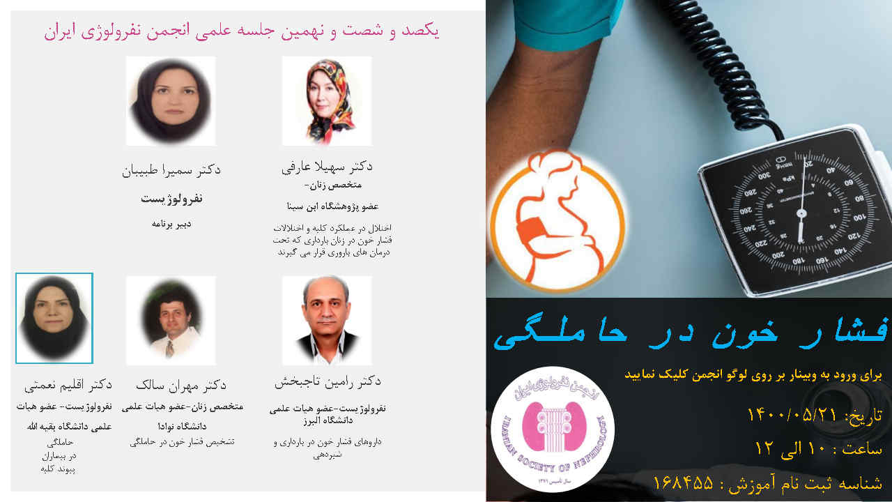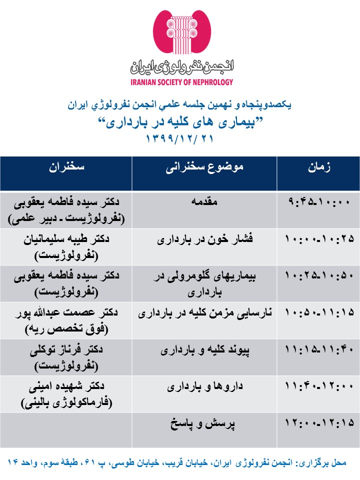 سخنرانان: دکتر شهرزاد عصاره، دکتر فرحناز دادرس، دکتر هوشنگ سندگل، دکتر بهاره مرغوب (نفرولوژیست)