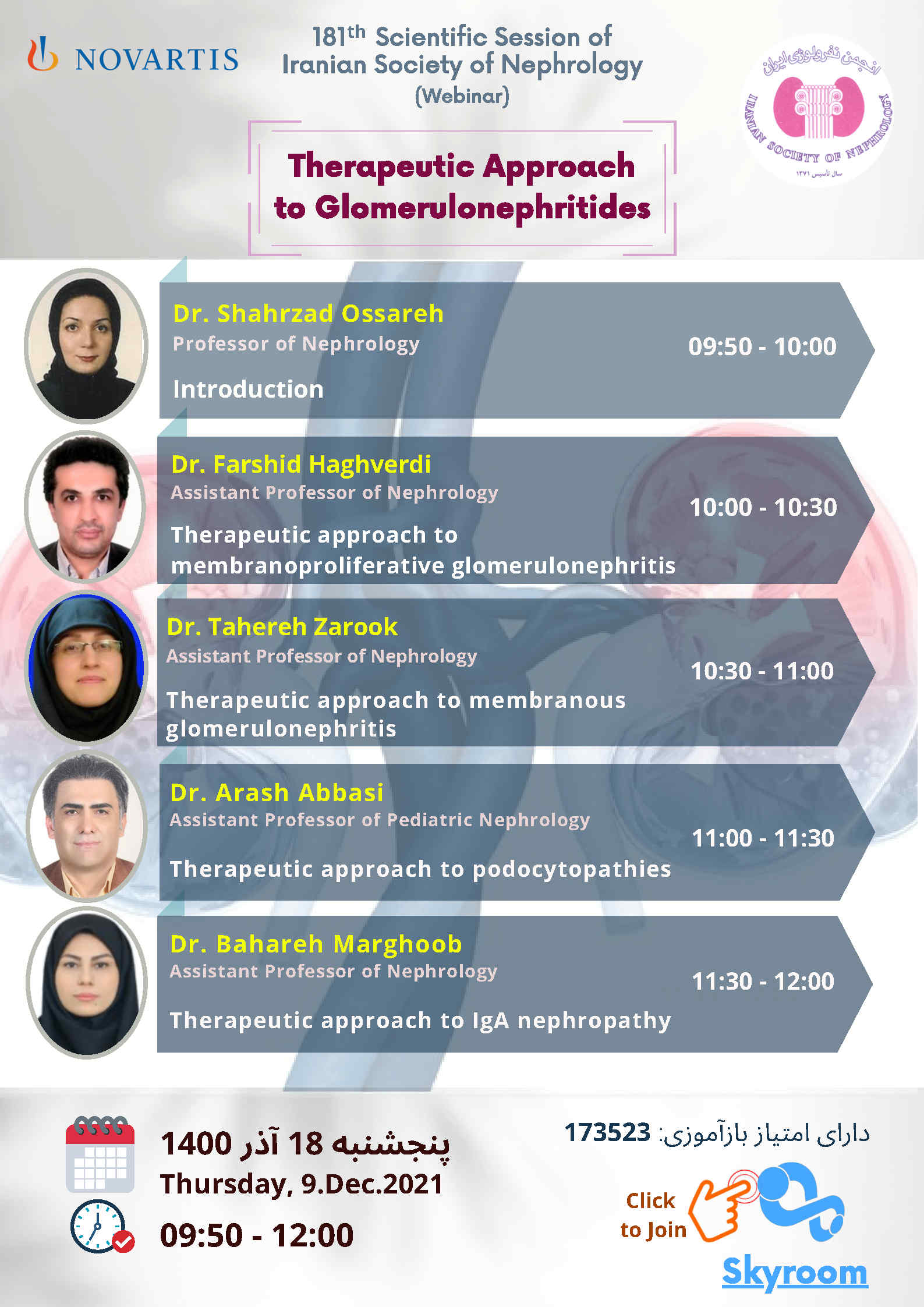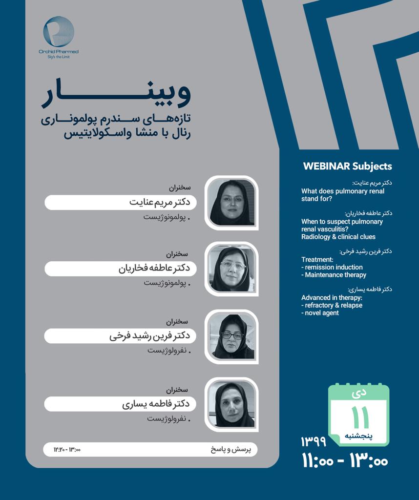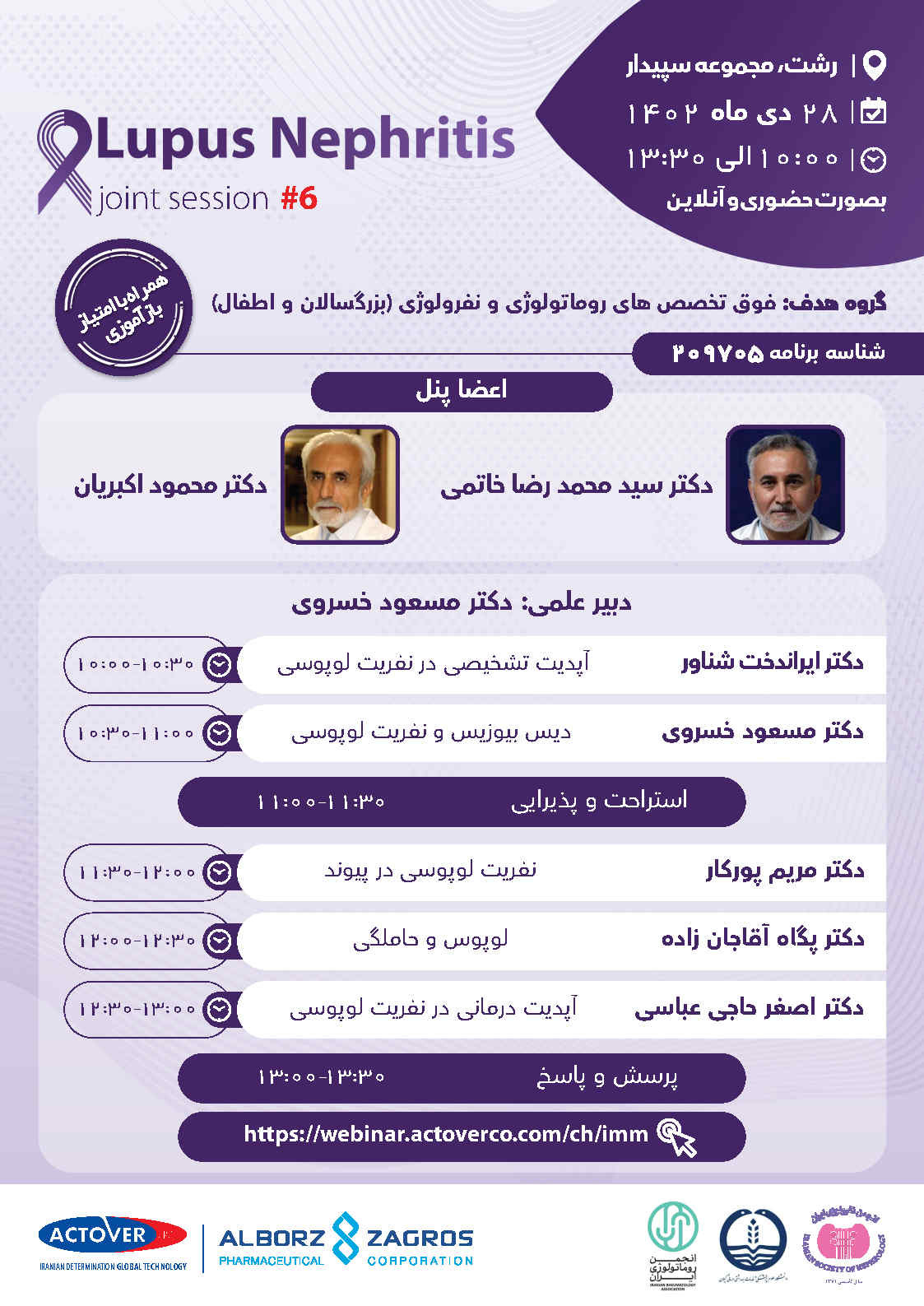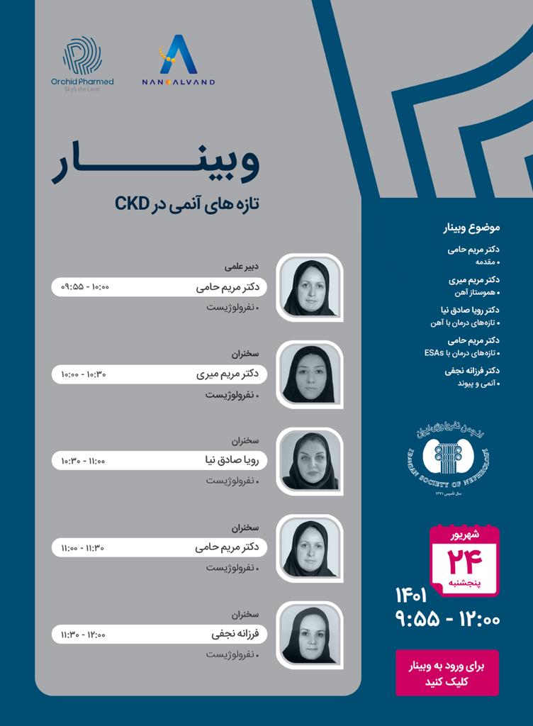 سخنرانان: دکتر شهرزاد عصاره، دکتر فرحناز دادرس، دکتر هوشنگ سندگل، دکتر بهاره مرغوب (نفرولوژیست)