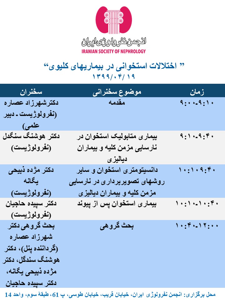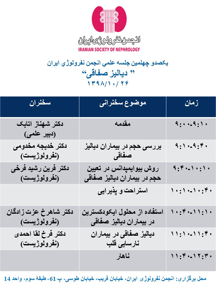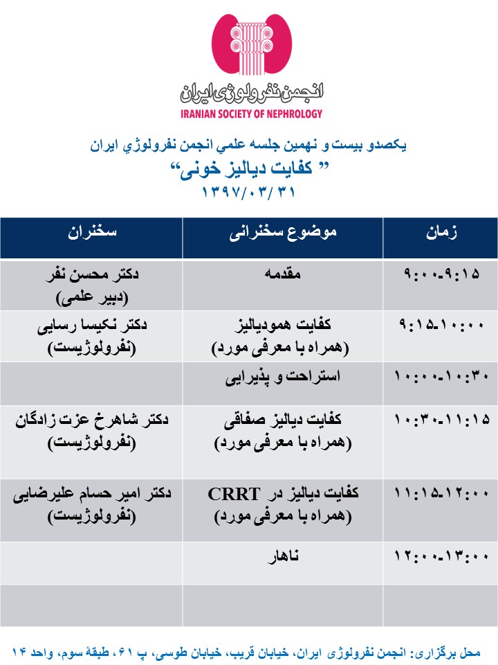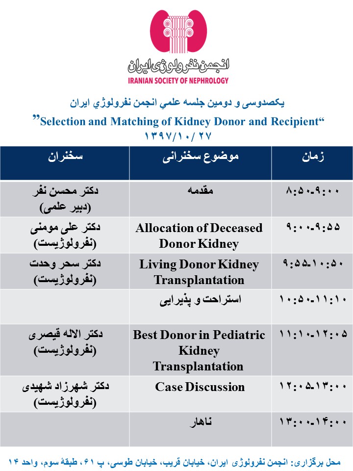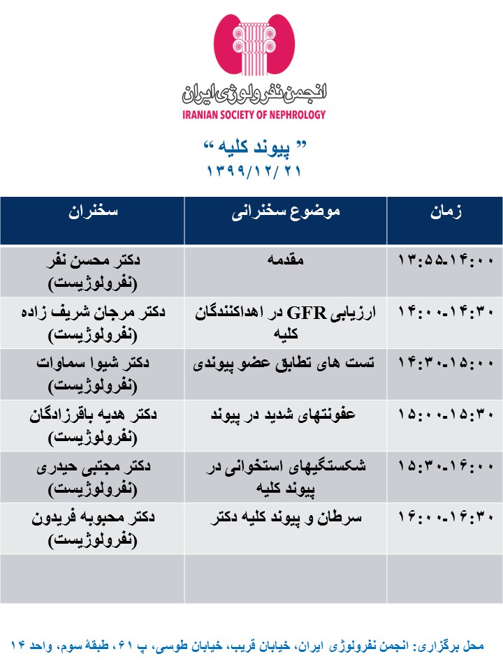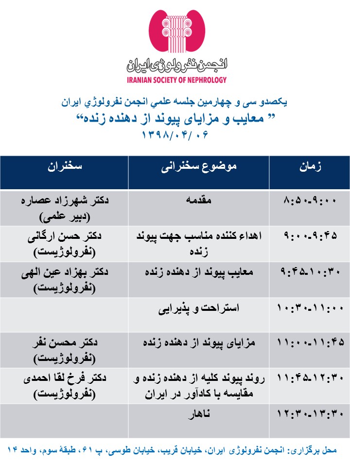 سخنرانان: دکتر عصمت عبداله پور (نفرولوژیست)، دکتر ایرج نجفی (نفرولوژیست)، دکتر حسن ارگانی (نفرولوژیست)، دکتر ورشاسب برومند (نفرولوژيست، تگزاس آمریکا)