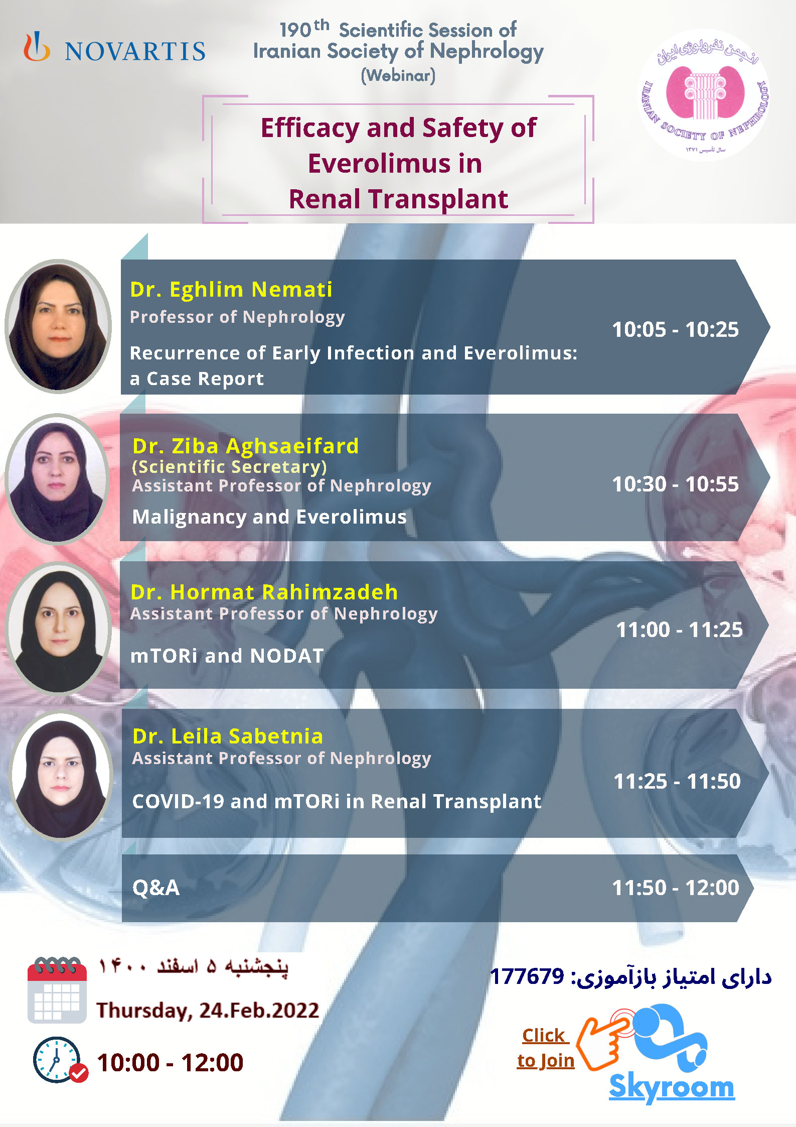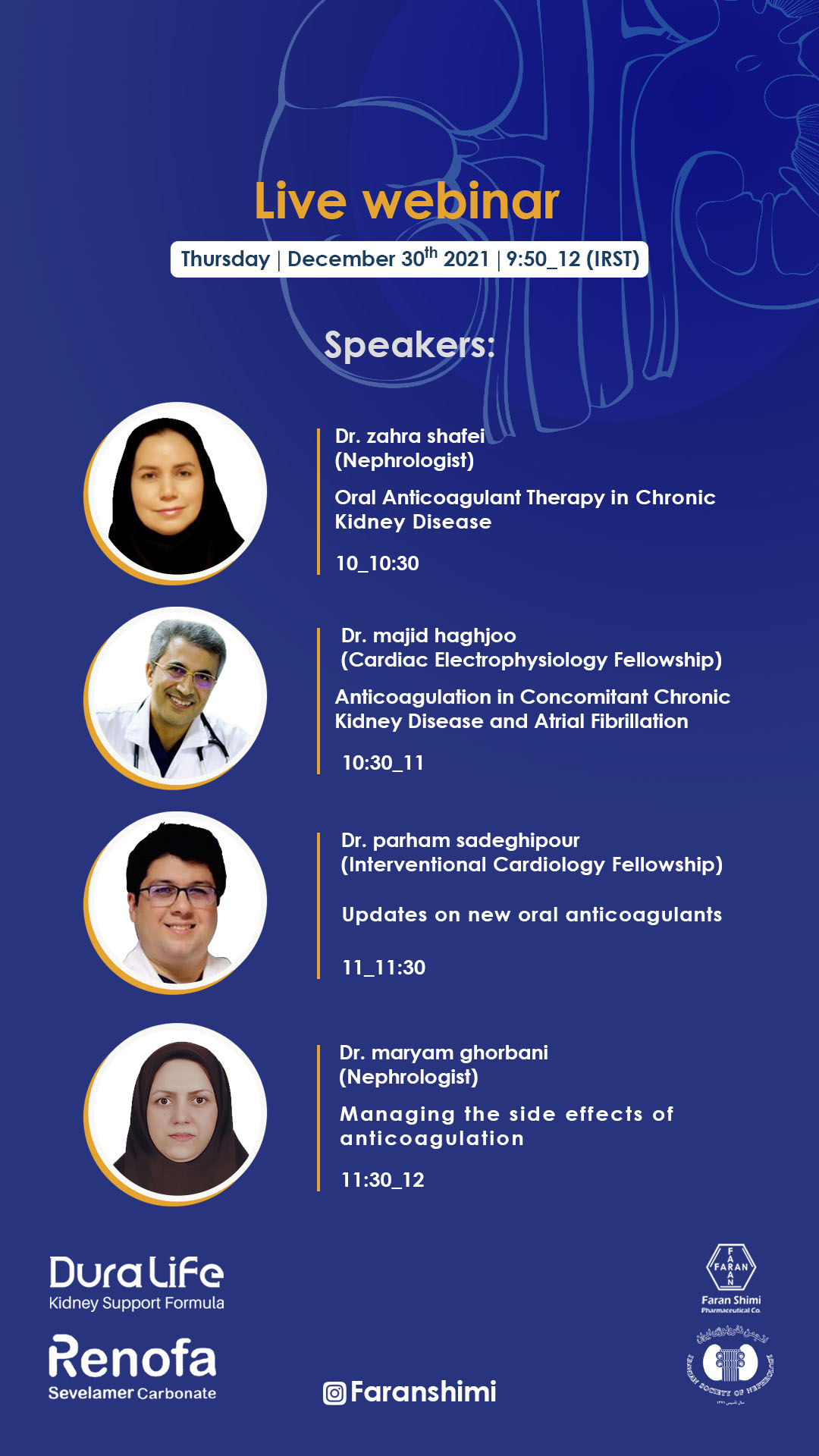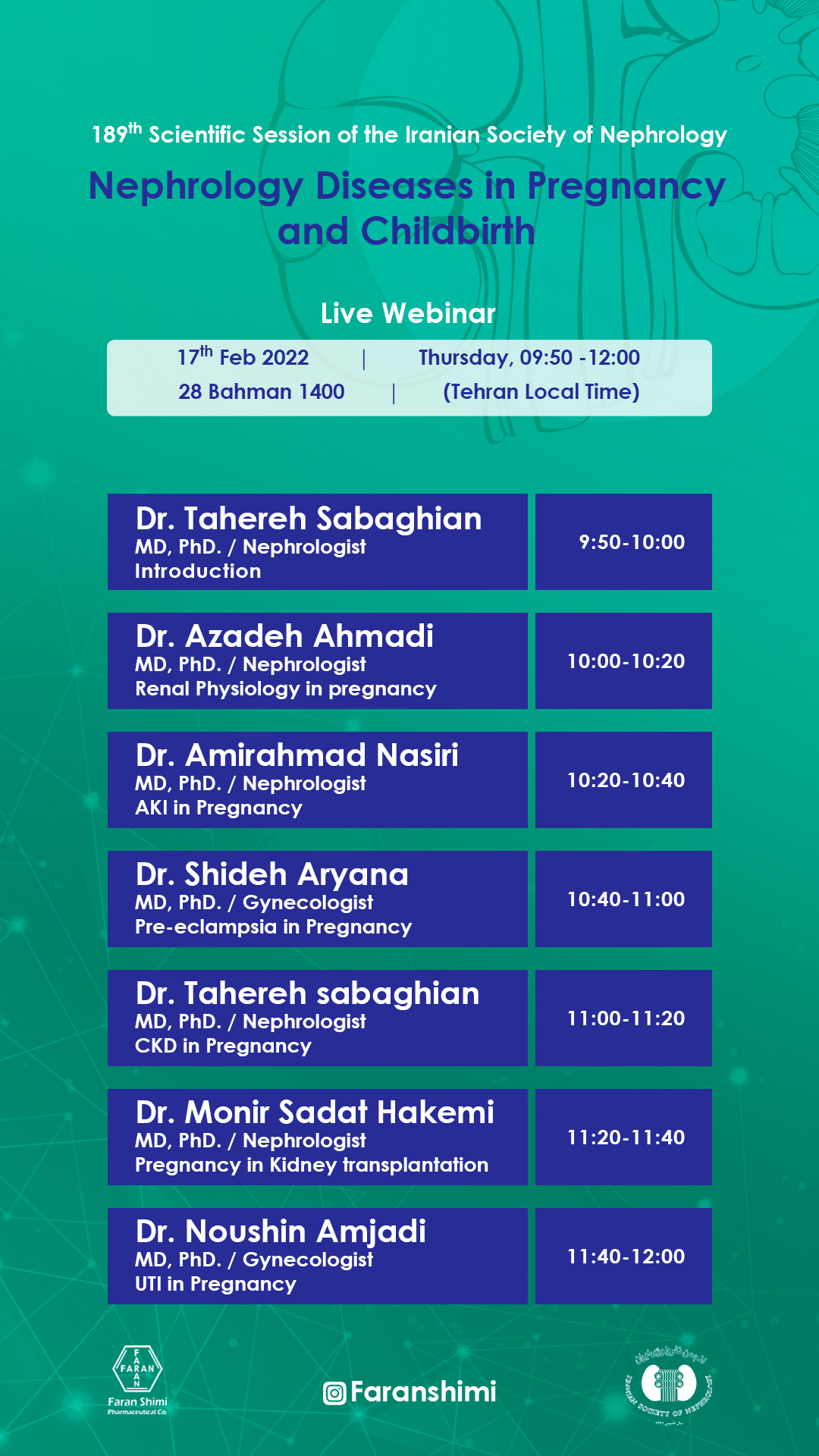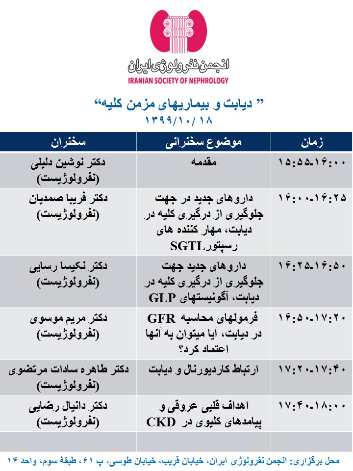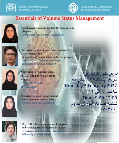 سخنرانان: دکتر زهرا شفيعي (نفرولوژیست)، دکتر فاطمه يساري (نفرولوژیست)، دکتر سميرا طبيبان (نفرولوژیست)، دکتر پرهام صادقيپور (كارديولوژيست)، دكتر آزيتا طلاساز (كارديولوژيست)