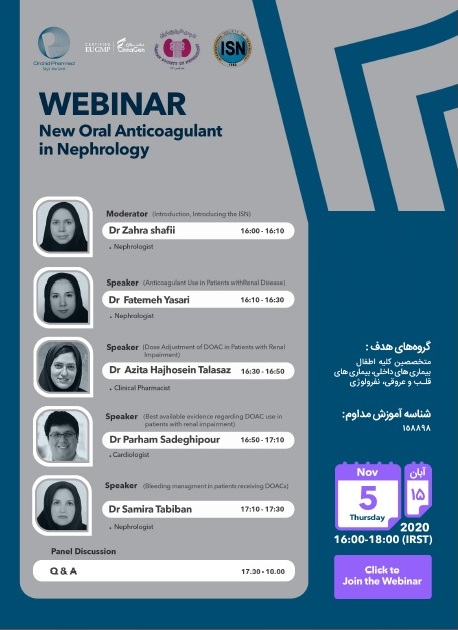 وبینار "آنتي كواگولانتها-Anti-Coagulants" پنجشنبه 15 آبانماه، ساعت 16 الی 18 برگزار شد.