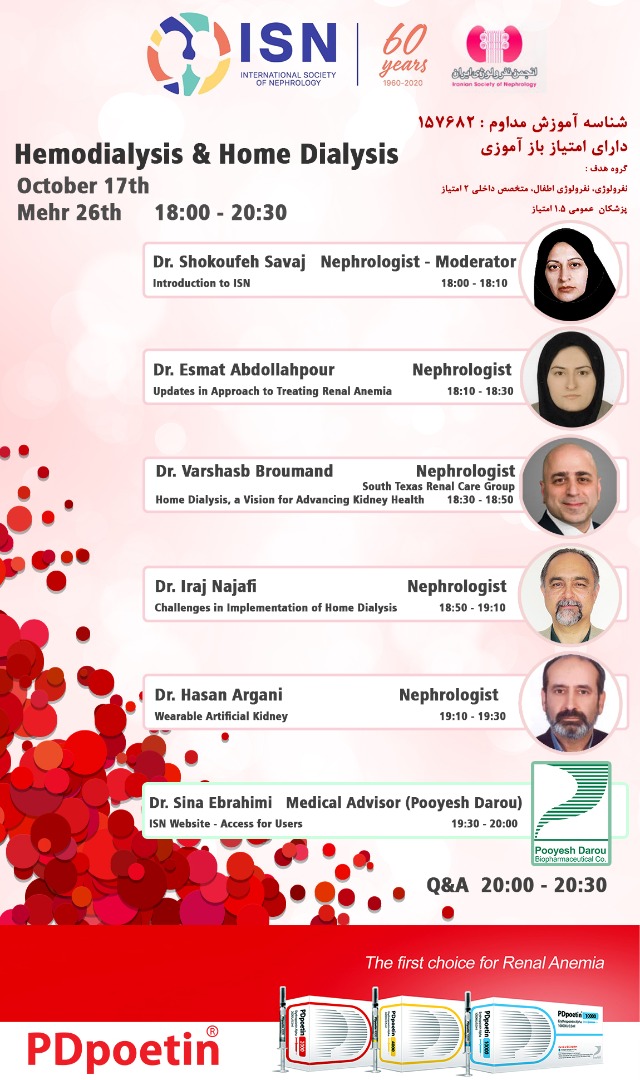 وبینار "همودیالیز و دیالیز در منزل" شنبه 26 مهرماه، ساعت 18 الی 20 برگزار شد.